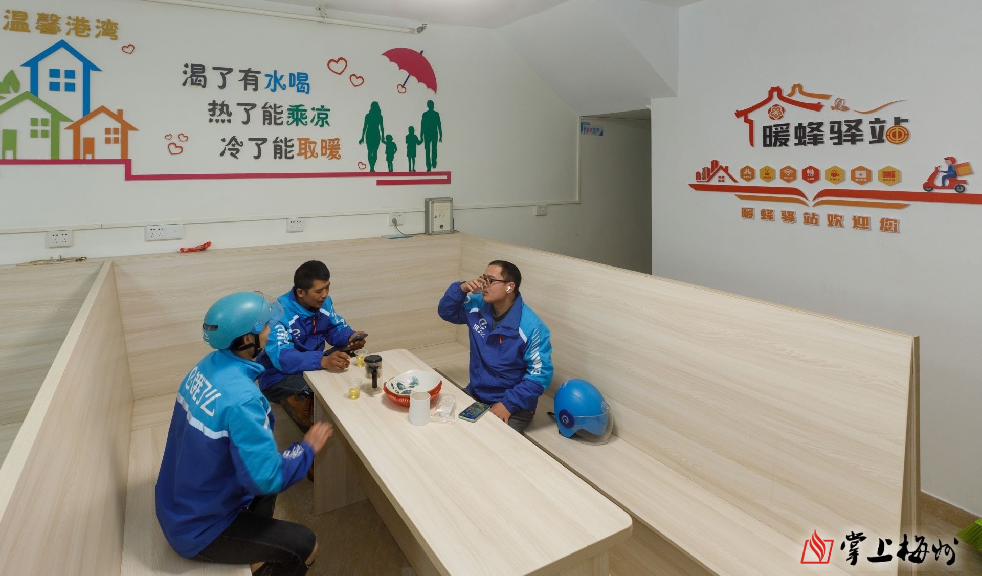 外卖骑手在暖蜂驿站休息。(林翔 摄)