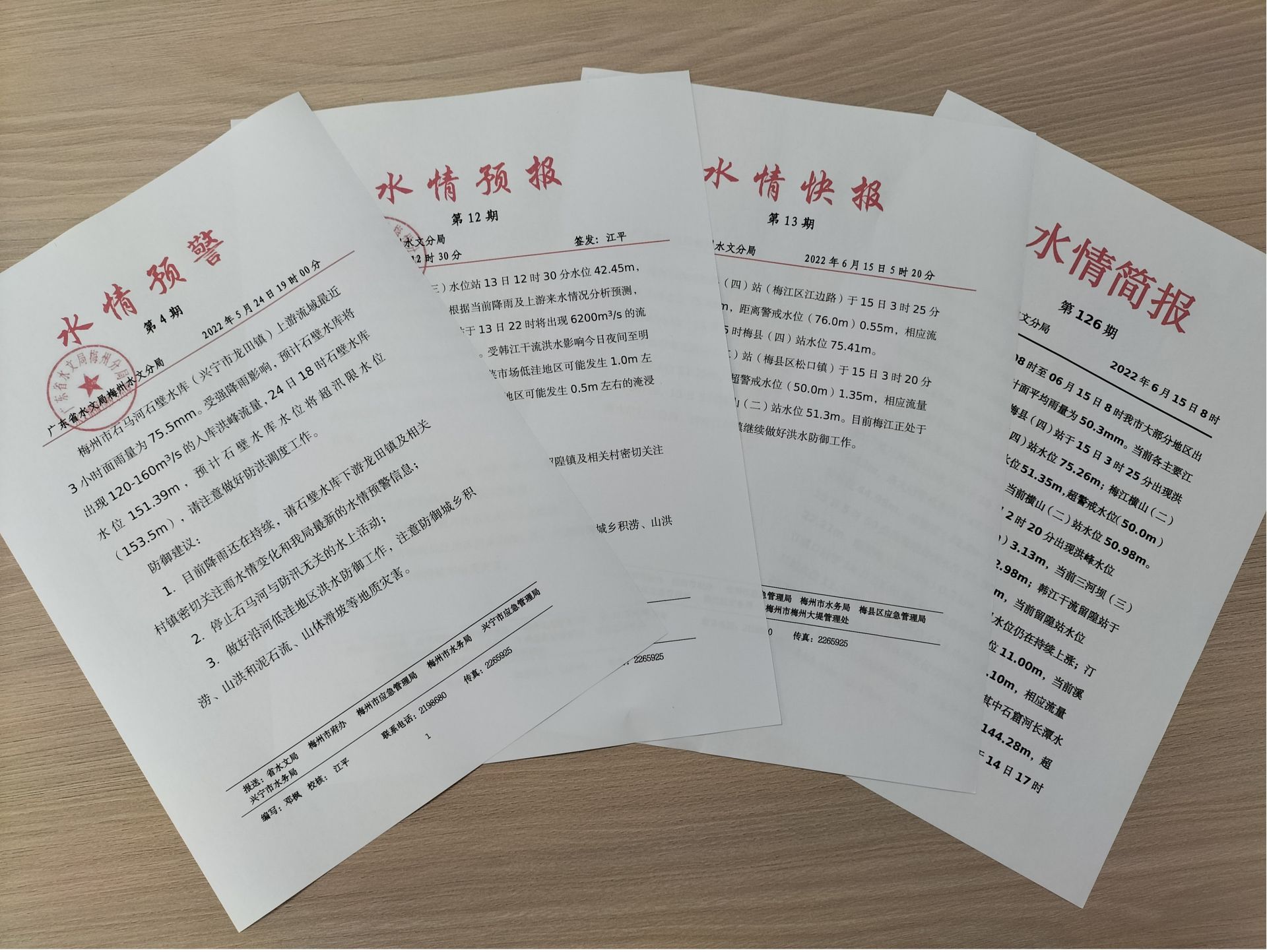 服务防汛减灾工作成效显著。一是做好防洪预警预报。每年汛期,广东省水文局梅州水文分局不断强化水文滚动预报和联合会商,迅速启动应急响应,及时准确发出洪水预警预报信息,精细解读,为决策部门提供梅州市骨干水库防洪调度建议,腾库拦洪、合理控泄,充分发挥工程拦洪、削峰、错峰作用,为我市成功抗击“13.8”(五华县特大暴雨洪水)、“19.6”(五华河历史实测最大流量洪水)、“20.6”(柚树河特大洪水)、“韩江2022年第1号洪水”等多场洪水,保障水利工程及上下游地区防洪安全,做好防汛减灾工作提供了有效的水文技术支撑,多次受到市三防、应急、水务部门的充分肯定。二是拓展水情预警信息的服务群体。通过自主开发的水雨情监测预警预报系统,实现了向市、县、镇、村及各水利工程责任人共计6500多人预警信息的精准发布,打通水情信息发布和接收的最后一公里,年均发布水情预警短信30余万条,提高了基层防洪时效。三是做好高陂水利枢纽工程施工期洪水预报服务。修编枢纽坝址和上游水文站洪水预报方案,滚动报送坝址流量过程和洪水预报信息,为国家重要水利工程的顺利施工提供安全保障。