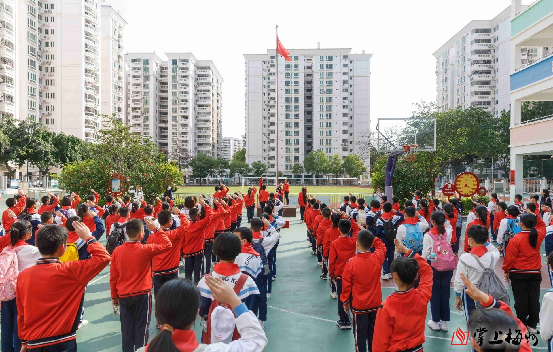 伴随着一阵阵欢迎的掌声,客都小学学生代表为这群远道而来的香港青少年佩戴红领巾。随后,客都小学的护旗手们手托国旗,迈着铿锵有力的步伐,向着升旗台行进。当《义勇军进行曲》旋律响起,香港、梅州两地的青少年全体肃立,目光紧紧跟随缓缓上升的五星红旗,深怀对祖国无限的热爱和崇高的敬意,向国旗敬礼。“我们学校也有升国旗,但在这里感觉特别不一样。”香港正觉莲社佛教正觉联社学校六年级学生张杨告诉记者,梅州是他好朋友的故乡,在此之前他就对梅州有一些了解,现在非常期待这趟旅程。