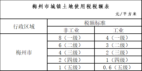 沿用2017年省政府批复的税额标准,非工业用地税额最高标准8元/平方米,最低标准1元/平方米。工业用地税额最高标准4元/平方米,最低标准0.6元/平方米。