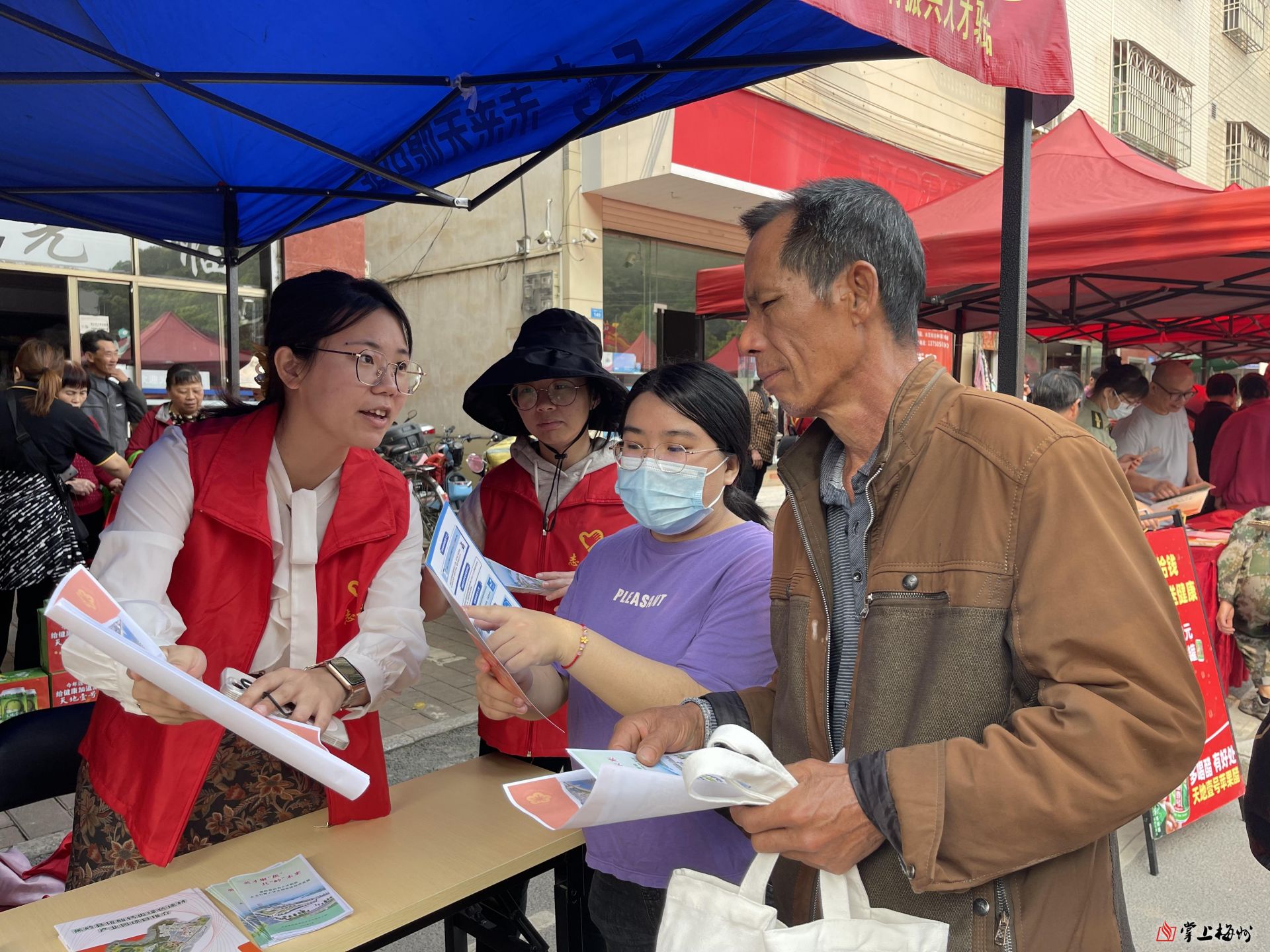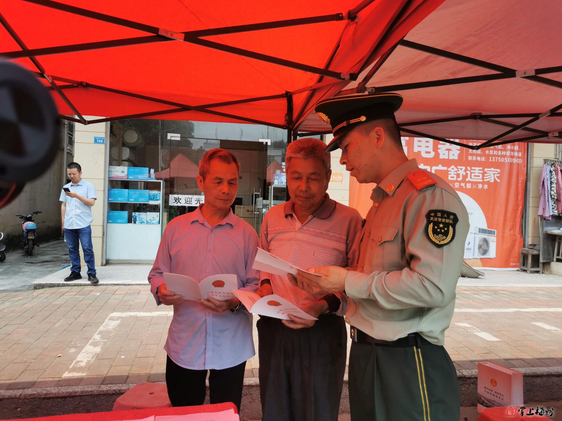 蕉岭县人武部工作人员正在为群众发放征兵宣传册、讲解参军政策。