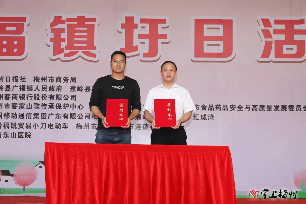 开圩仪式上,广福镇党委书记陈国政致辞,梅州市喜多多超市与蕉岭县鸿宸农业专业合作社进行农贸产品采购签约。