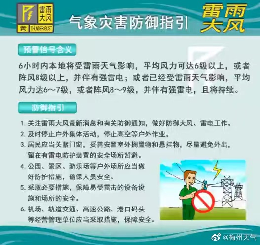 【梅江区雷雨大风黄色预警】2小时内受雷雨天气影响,本地将有6-8级短时大风,并伴有短时强降水,梅州市气象台19日11时26分发布了梅江区雷雨大风黄色预警信号,请注意防御! (通讯员:谢龙生)