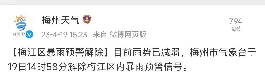 15时23分,梅江区暴雨预警解除。