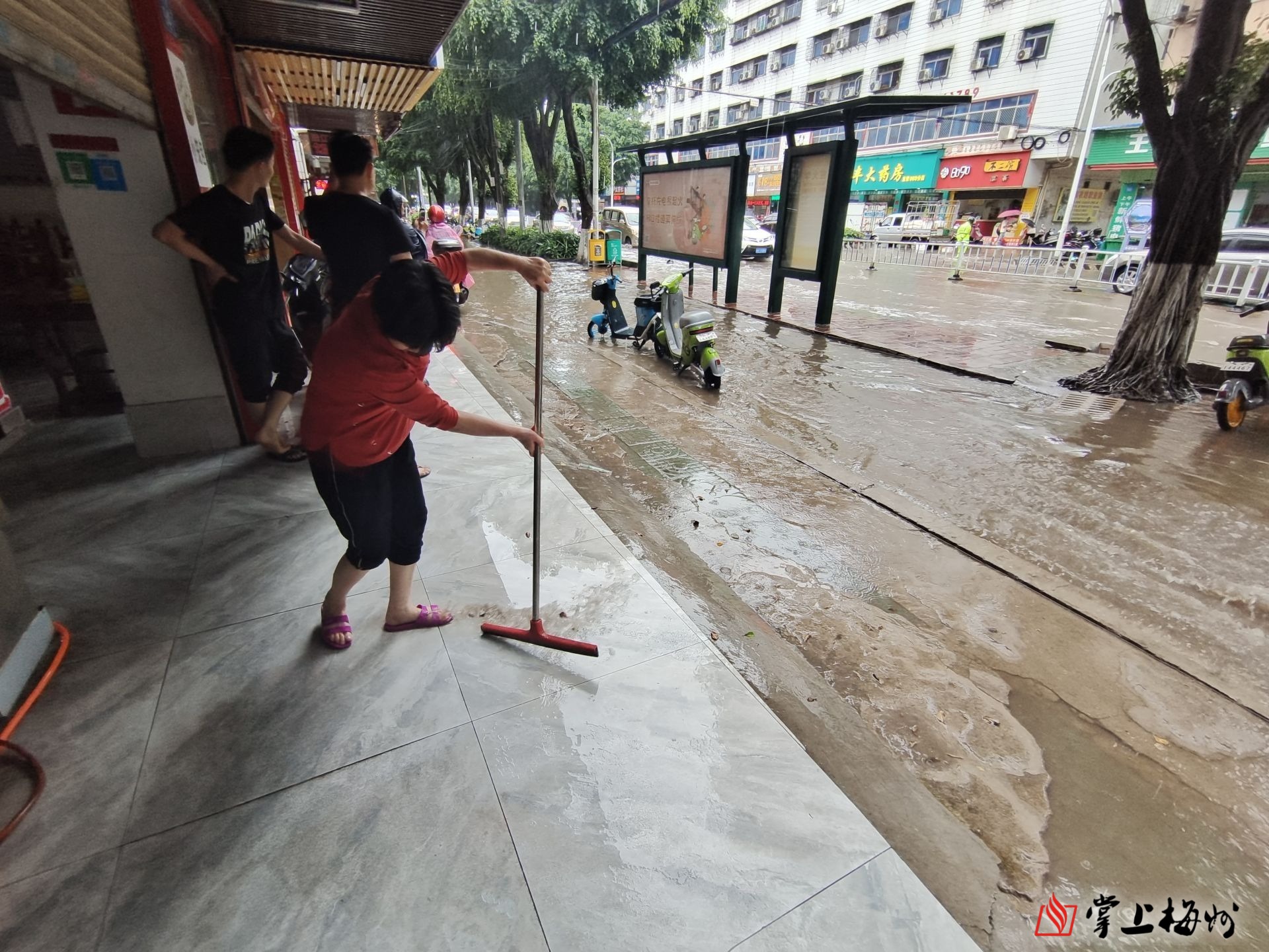 在梅松路积水严重路段,工作人员正在排水口进行清理。