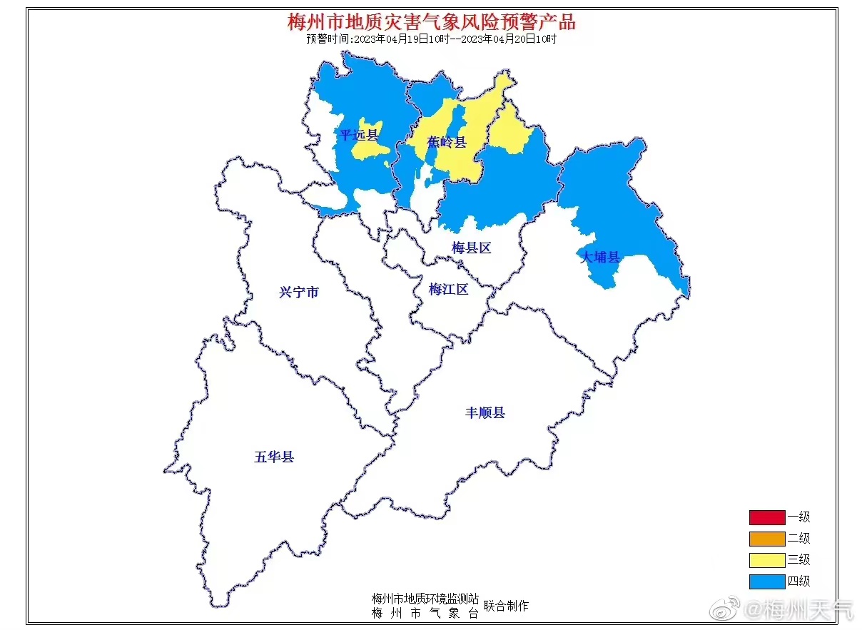 【地质灾害气象风险预警】2023年04月19日预警信息: 预计未来24小时,梅县区松源镇,平远县东石镇,蕉岭县文福镇、蓝坊镇、南磜镇、蕉城镇、长潭镇等地部分区域地质灾害预警等级为3级;梅县区白渡镇、隆文镇、桃尧镇、松口镇,大埔县湖寮镇、青溪镇、百侯镇、大东镇、茶阳镇、西河镇、丰溪林场,平远县石正镇、差干镇、河头镇、上举镇、泗水镇、热柘镇、仁居镇、大柘镇,蕉岭县三圳镇、广福镇、新铺镇、蕉华区等地部分区域地质灾害预警等级为4级。