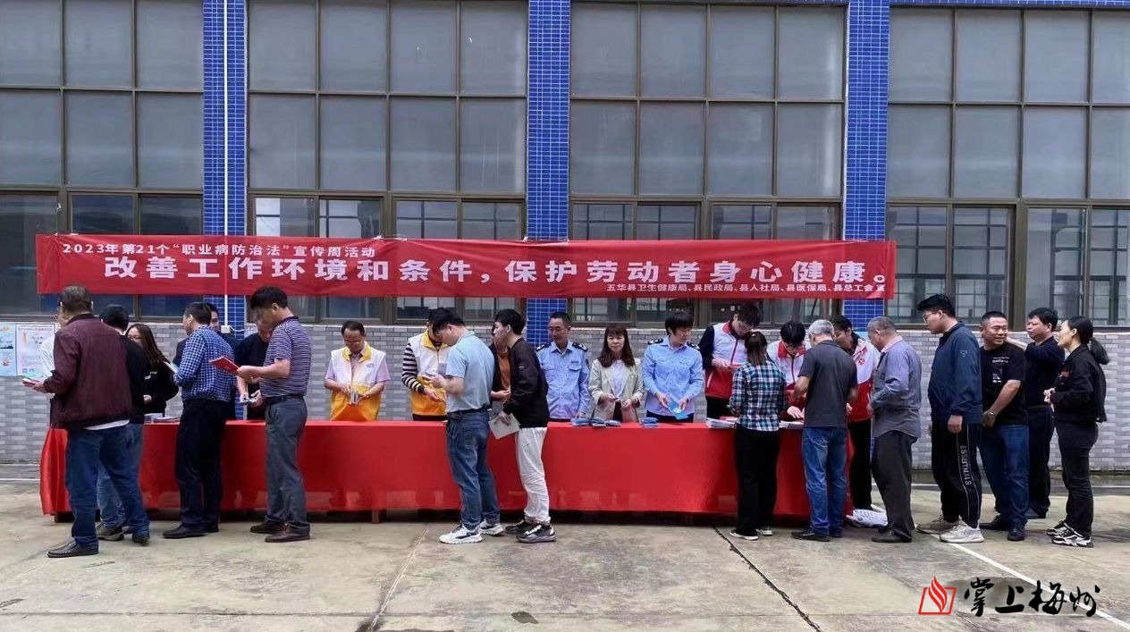 4月25日,五华县卫生健康局、民政局、人社局、医保局、总工会联合到县工业园进行《职业病防治法》等法律法规标准和政策阐释以及常见职业病防治知识科普。现场通过挂横幅、电子屏幕滚动播放、微信转发、线上学习、张贴宣传画报、现场咨询、发放宣传小册子等多种方式进行了宣传。