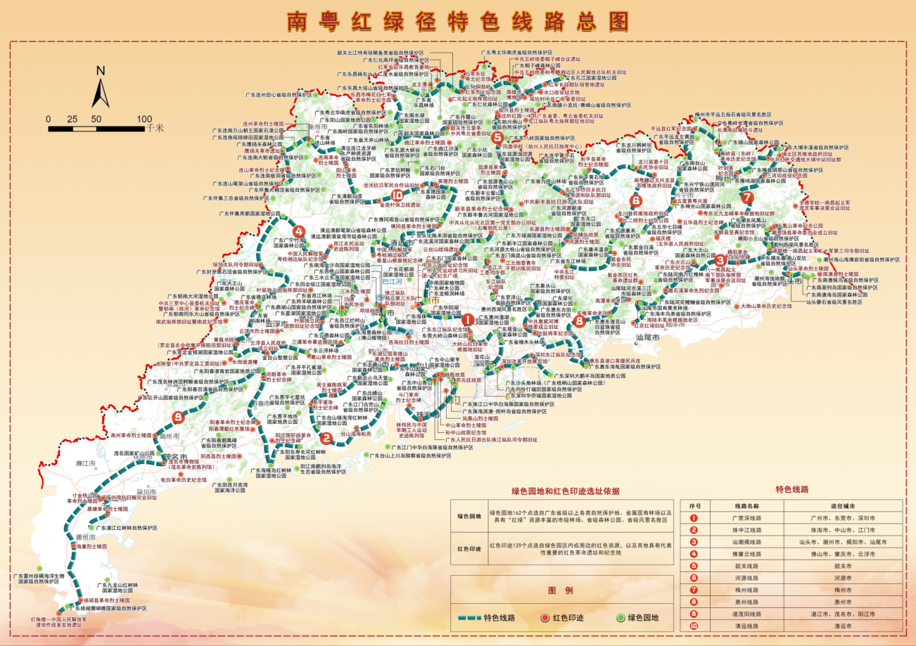特色线路将省内若干个绿色园地、红色印记串珠成链。其中,绿色园地162个点选自广东省级以上各类自然保护地、省属国有林场以及具有“红绿”资源丰富的市级林场、省级森林公园、省级风景名胜区;红色印记129个点选自绿色园区内或周边的红色资源,以及其他具有代表性重要的红色革命遗址和纪念地。其中,梅州线路包含了广东五华七目嶂省级自然保护区、广东神光山国家森林公园等11个绿色园地,以及丰顺县坚真纪念馆、三河坝战役纪念园等12个红色印记。