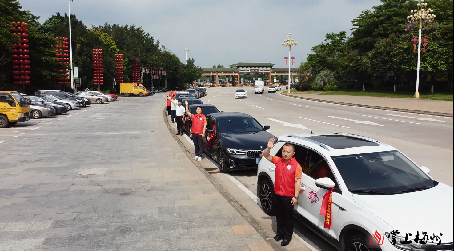 市新阶联组织会员开展爱心护考活动,会员们拿上红飘带绑在车辆的一侧镜子上,启动车子奔走在梅城的大街小巷。(受访者供图)