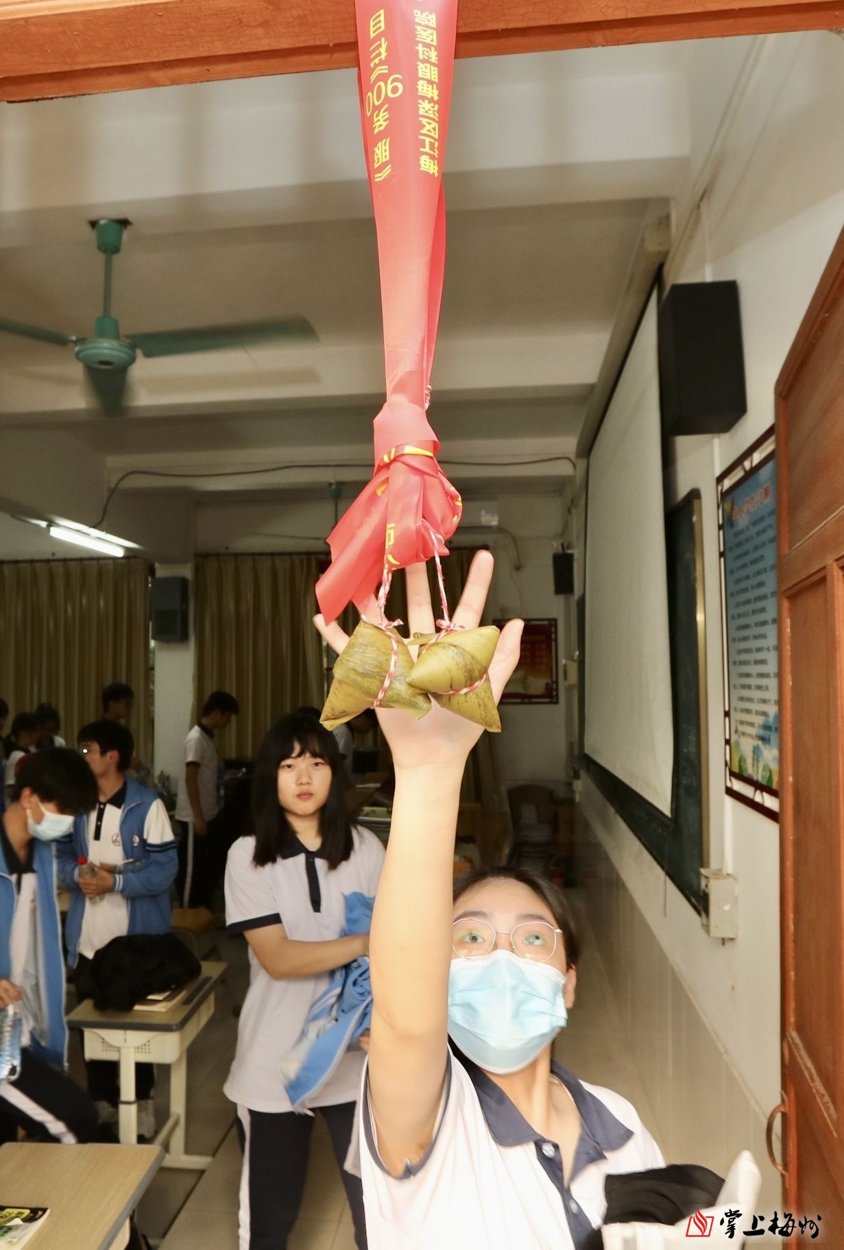 在广东梅县东山中学、梅县区高级中学、梅雁中学等学校,不少科任老师特意戴上印有“金榜题名”的手环,给学生发放棒棒糖,部分班级还在班级门梁上用红绳悬挂了一颗粽子,考生们从教室出来时,依次触碰并用头顶粽子,寓意“一举高中(粽)”。