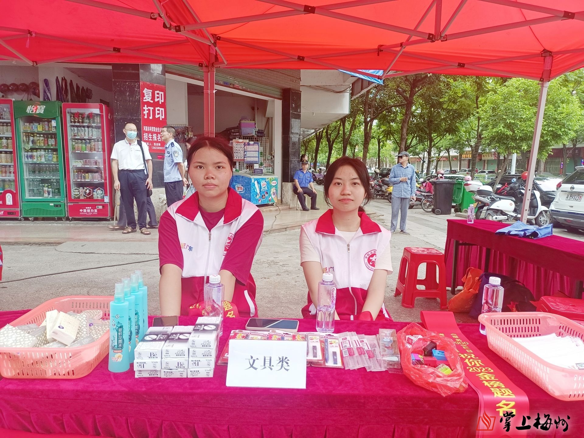 在梅县区华侨中学考点,两位高二年级的志愿者早早地到考点为考生提供志愿服务。(吴丽伶 摄)