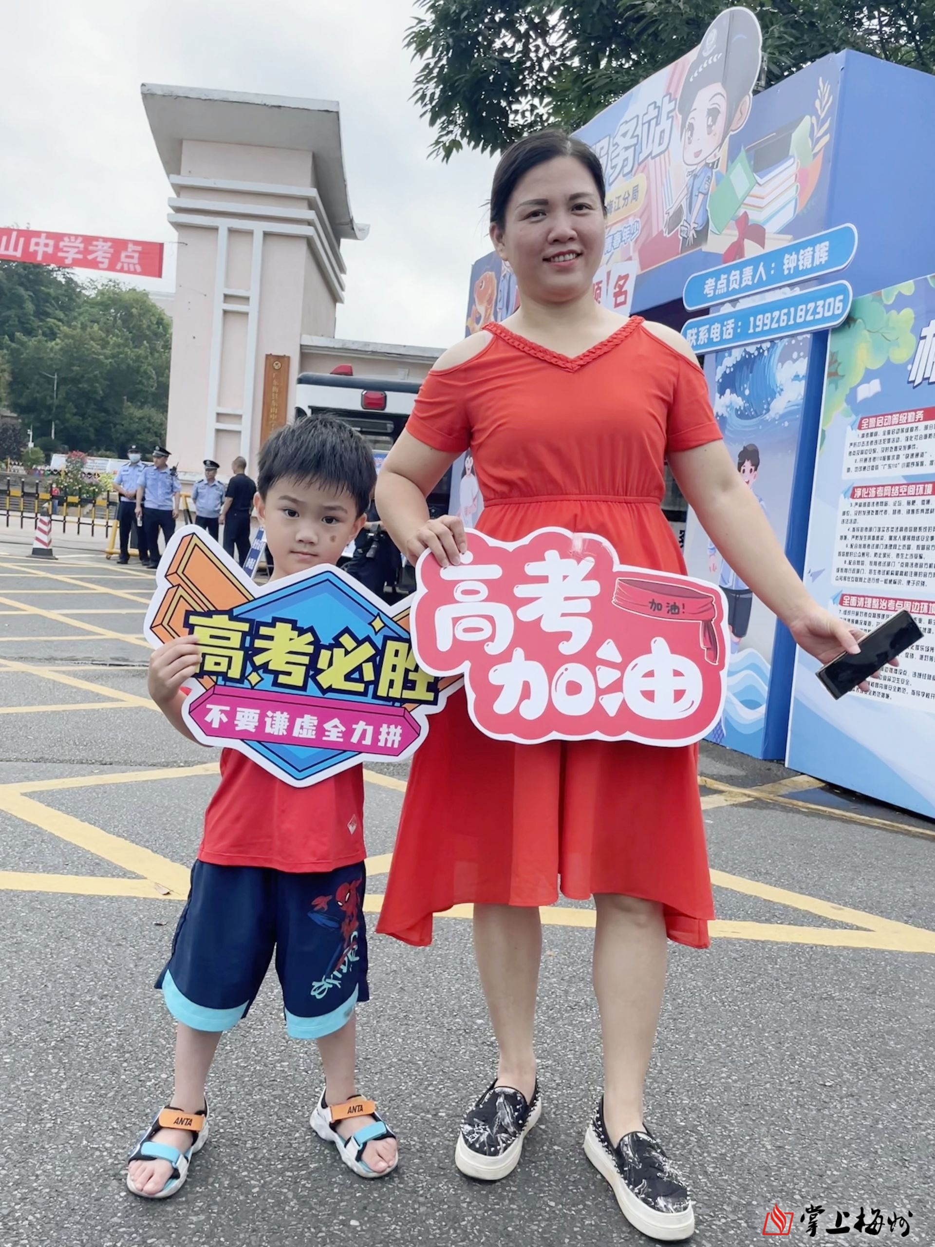邱女士和小儿子带了特制加油牌,给孩子加油。(吴海清 摄)