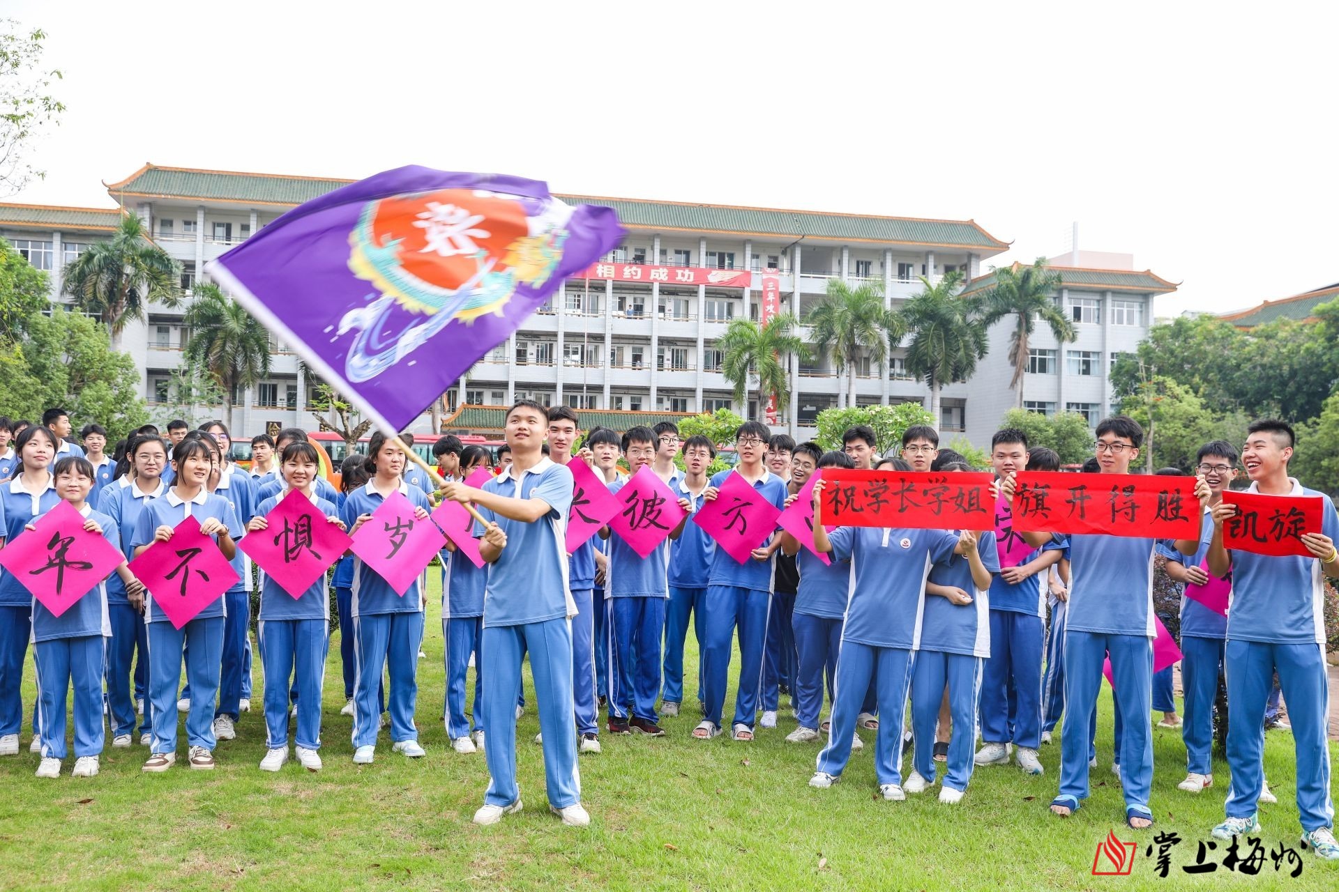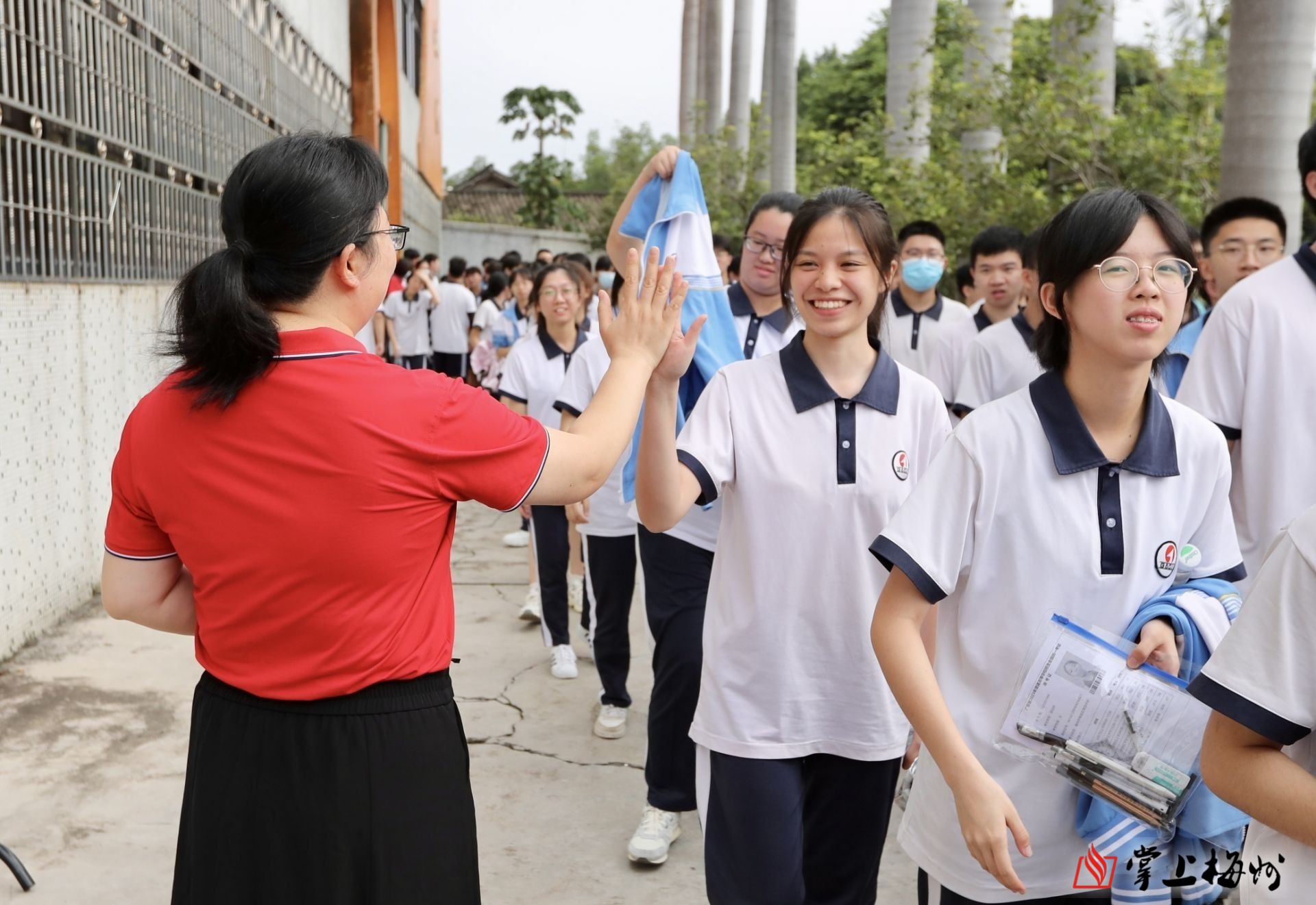 同一时间,在梅州市曾宪梓中学,该校高三年级全体教师身着红衣,与考生们击掌,为他们鼓劲;由家长组成的送考团中,有的身着旗袍,有的手持“旗开得胜”“一举夺魁”等内容的加油KT板,与高一高二级的学生们一起,用热情的呐喊声给考生们送上最温暖的祝福。