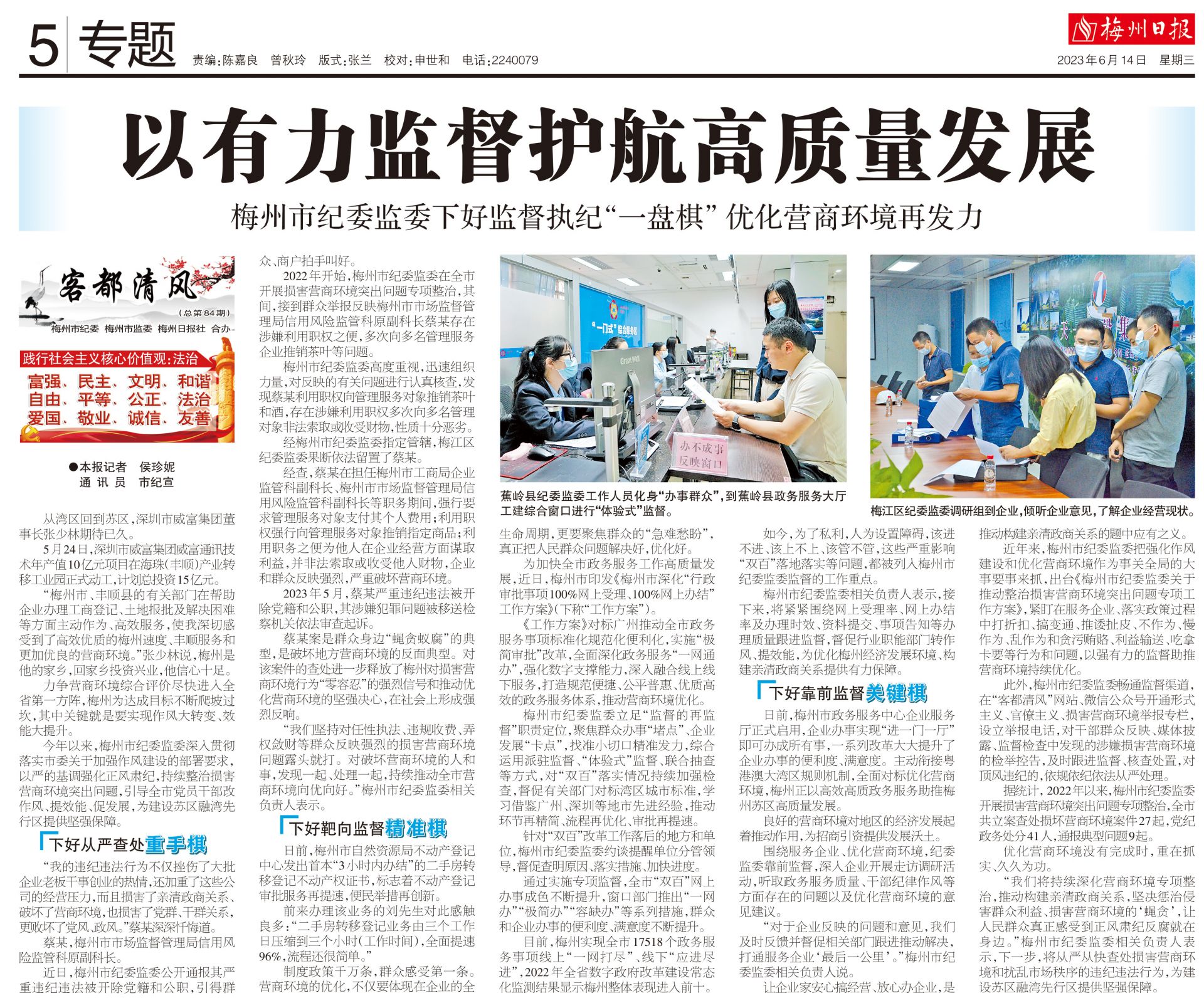 此外,梅州市纪委监委畅通监督渠道,在“客都清风”网站、微信公众号开通形式主义、官僚主义、损害营商环境举报专栏,设立举报电话,对干部群众反映、媒体披露、监督检查中发现的涉嫌损害营商环境的检举控告,及时跟进监督、核查处置,对顶风违纪的,依规依纪依法从严处理。
