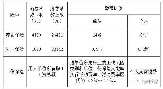 (二)失业保险。缴费基数上限为23142 元/月,低于 23142元的应如实申报,但不得低于梅州市企业职工月最低工资标准1620元。单位缴费基数按本单位全部职工缴费工资基数之和核定。职工缴费工资基数为本人上年度月平均工资,新参加工作的职工缴费工资基数为起薪当月工资。