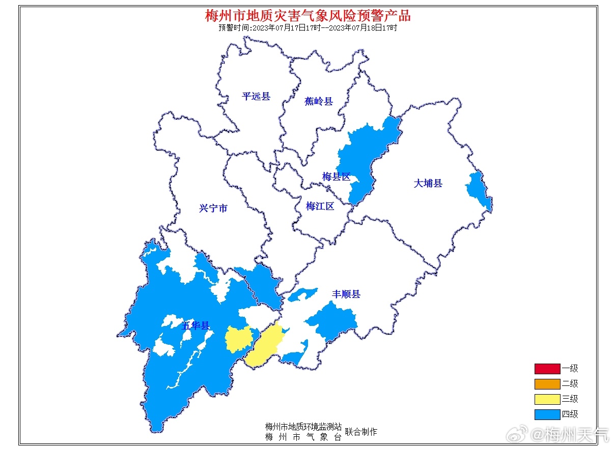 17日下午,市气象局发布地质灾害气象风险预警:预计未来24小时,丰顺县八乡山镇,五华县双华镇等地部分区域地质灾害预警等级为3级;梅县区雁洋镇、松口镇,大埔县大东镇,丰顺县汤西镇、汤南镇、埔寨镇、建桥镇、汤坑镇,五华县转水镇、潭下镇、梅林镇、华阳镇、周江镇、河东镇、岐岭镇、长布镇、横陂镇、安流镇、棉洋镇、龙村镇,兴宁市水口镇等地部分区域地质灾害预警等级为4级。 请上述地区政府、部门和群众根据预警等级采取相应的应急措施:蓝色预警,气象因素致地质灾害发生有一定风险。风险预警时间内对重要地质灾害隐患点24小时监测,密切关注地质灾害气象风险预警。