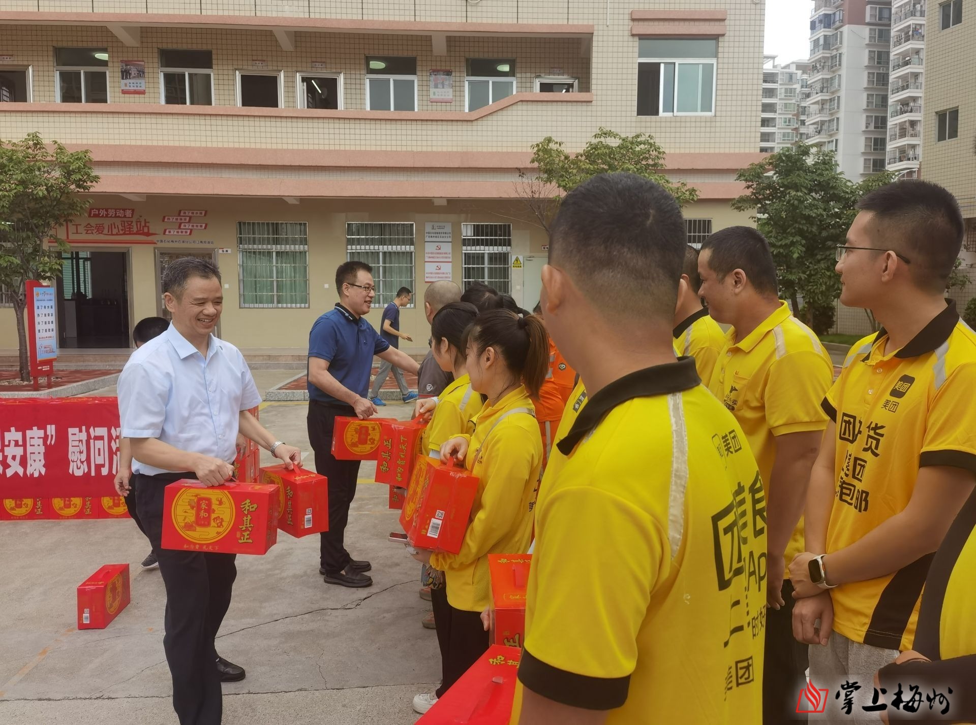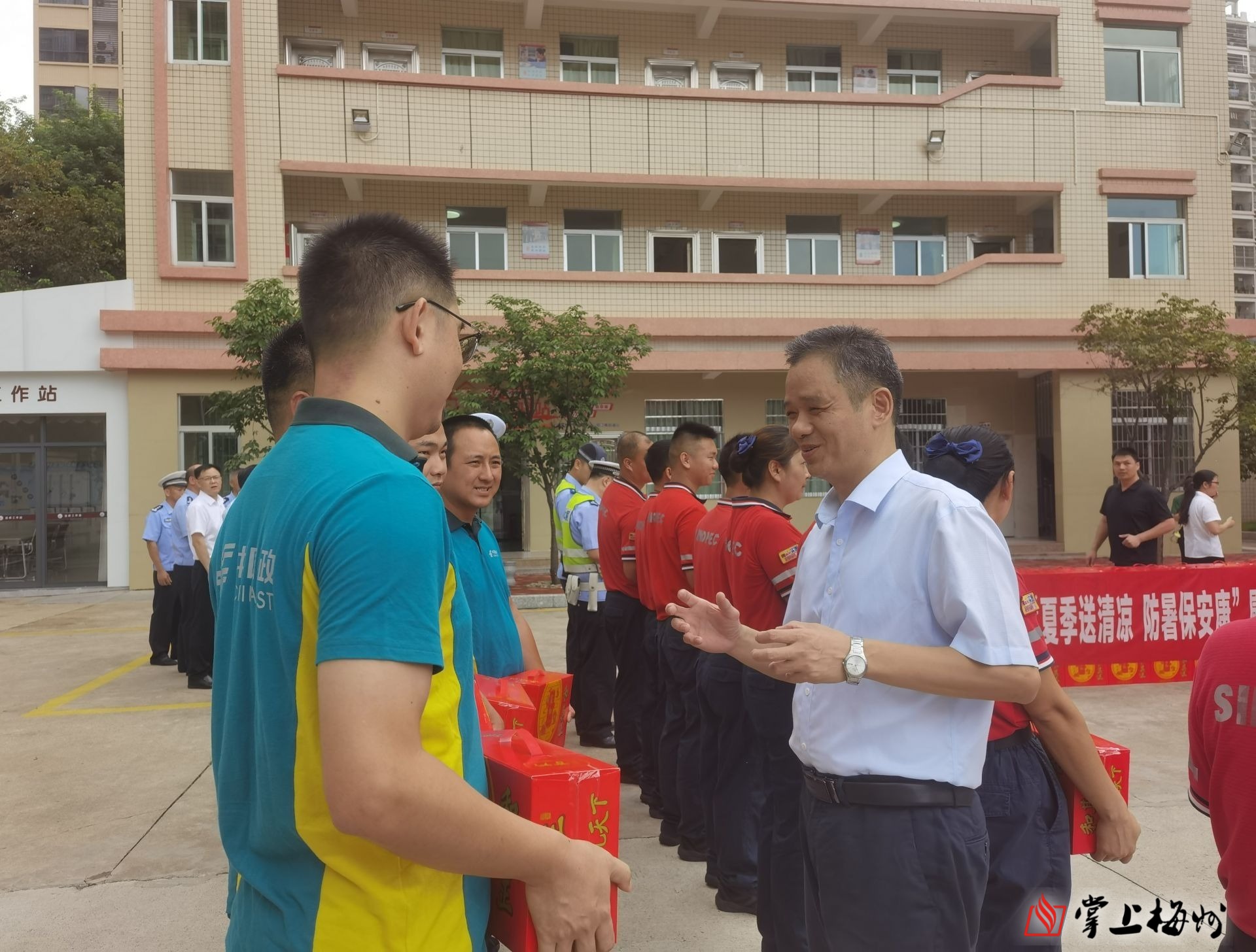 掌上梅州讯 8月2日上午,梅州市总工会举行2023年“夏季送清凉 防暑保安康”慰问活动,为奋战在高温一线的户外工作者送上党和政府的关怀。市人大常委会副主任、市总工会主席张达宏参加。