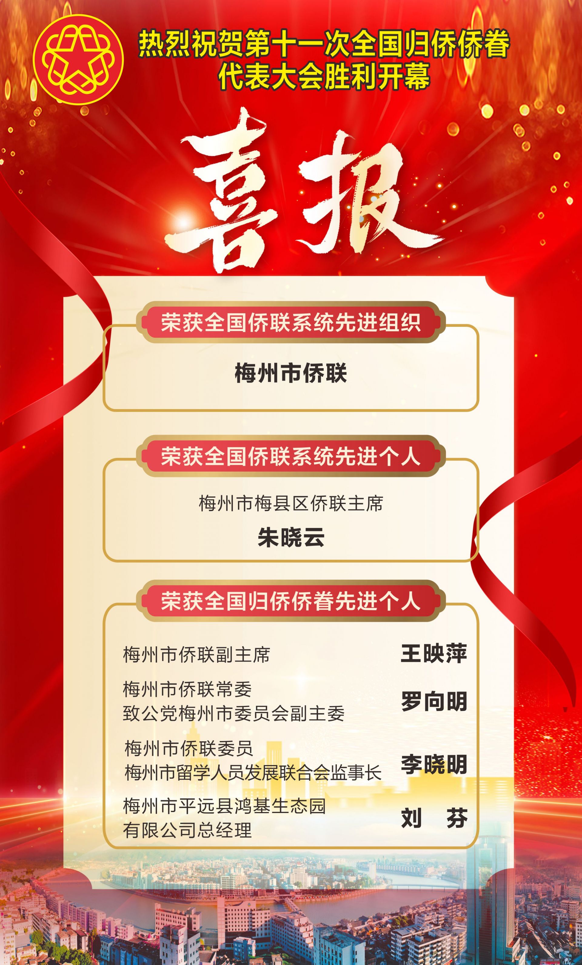 其中,梅州市侨联荣获“全国侨联系统先进组织”荣誉称号。梅州市梅县区侨联主席朱晓云荣获“全国侨联系统先进个人”荣誉称号;梅州市侨联副主席王映萍,梅州市侨联常委、致公党梅州市委员会副主委罗向明,梅州市侨联委员、梅州市留学人员发展联合会监事长李晓明,梅州市平远县鸿基生态园有限公司总经理刘芬荣获“全国归侨侨眷先进个人”荣誉称号。