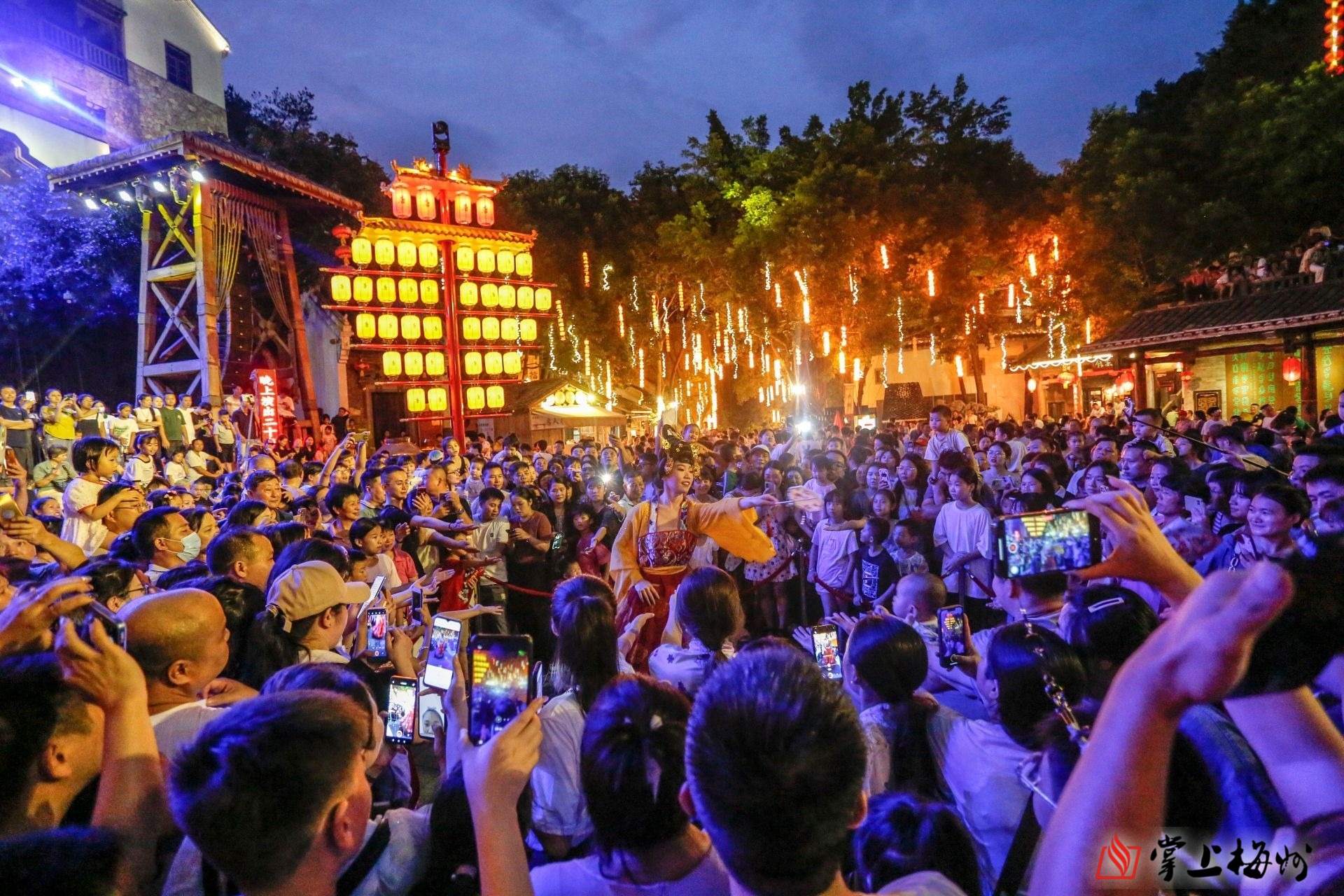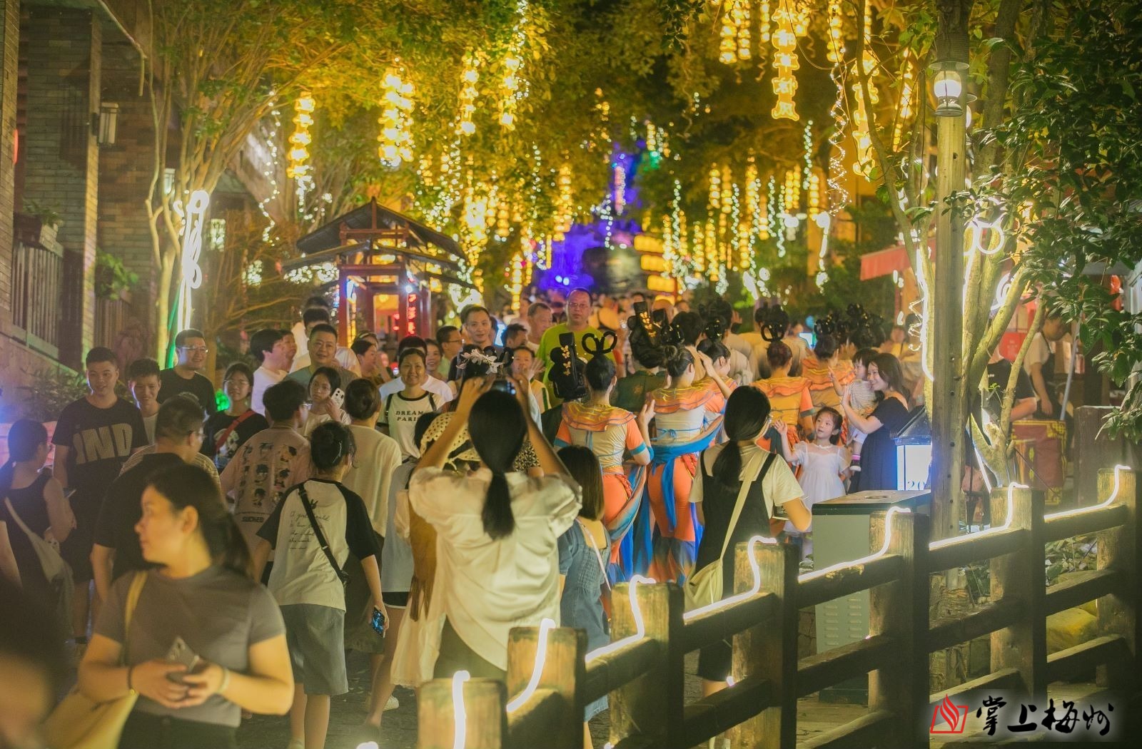 国潮不夜城灯光秀绚烂无比,唐风节目演艺大唐不倒翁少女、唐宫美女巡游、客家综合演出等尽显古典风情,国潮古风夜市上各类网红小吃让游客大饱口福……今年7月21日晚,客天下旅游度假区“世界客都国潮不夜城”试营业第一天,丰富多样的活动内容就吸引了超过1万名游客前来打卡体验。