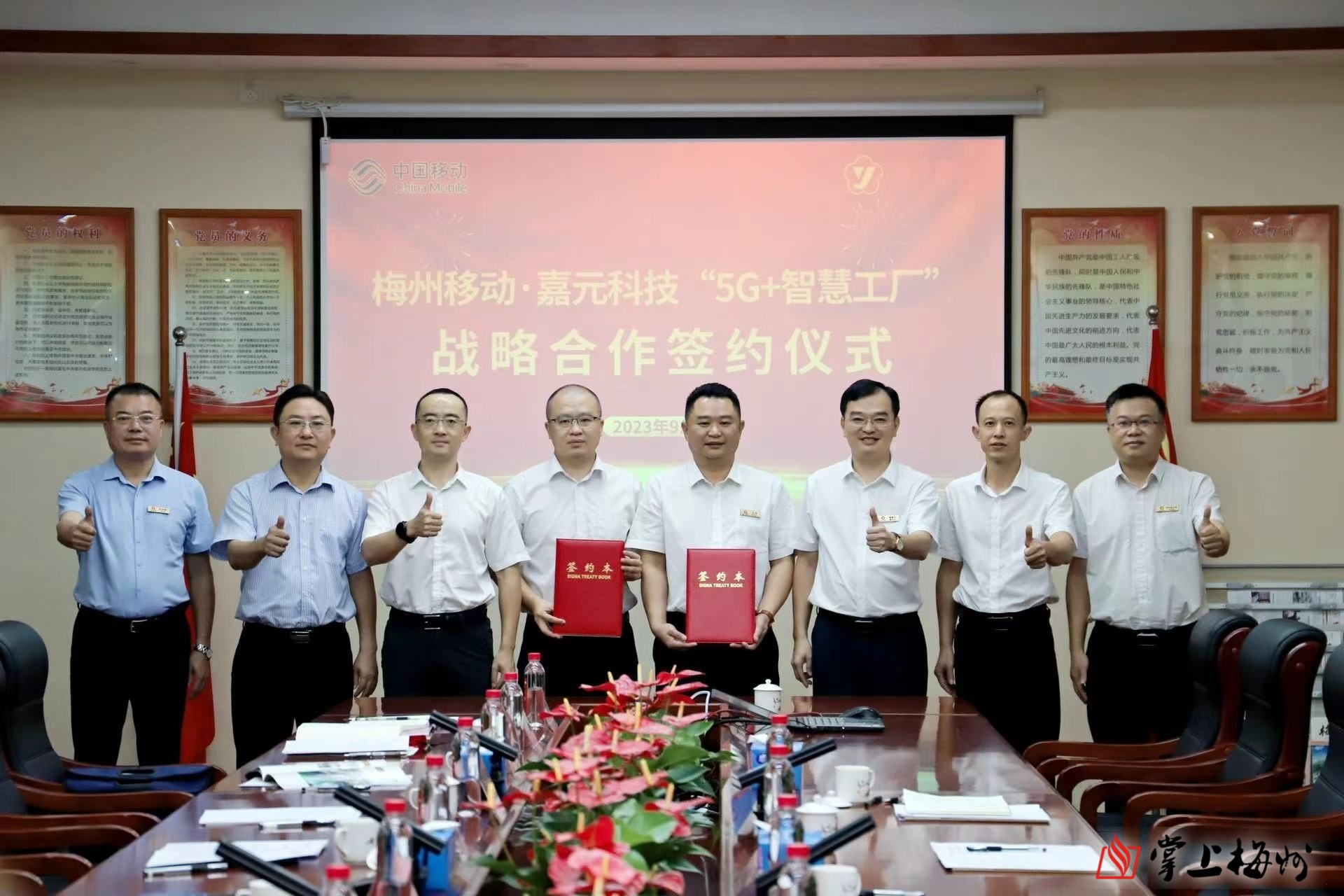 掌上梅州讯 9月11日,梅州移动和广东嘉元科技股份有限公司在嘉元科技雁洋总部共同签署5G智慧工厂建设战略合作协议,拟携手打造梅州标杆级5G智慧工厂。梅州移动副总经理黄伟华、嘉元科技总裁杨剑文代表签约,梅县区政府副区长王宏基、梅州市工业和信息化局总经济师邓文光,梅州移动总经理曾鹏,嘉元科技董事长廖平元等见证签约。