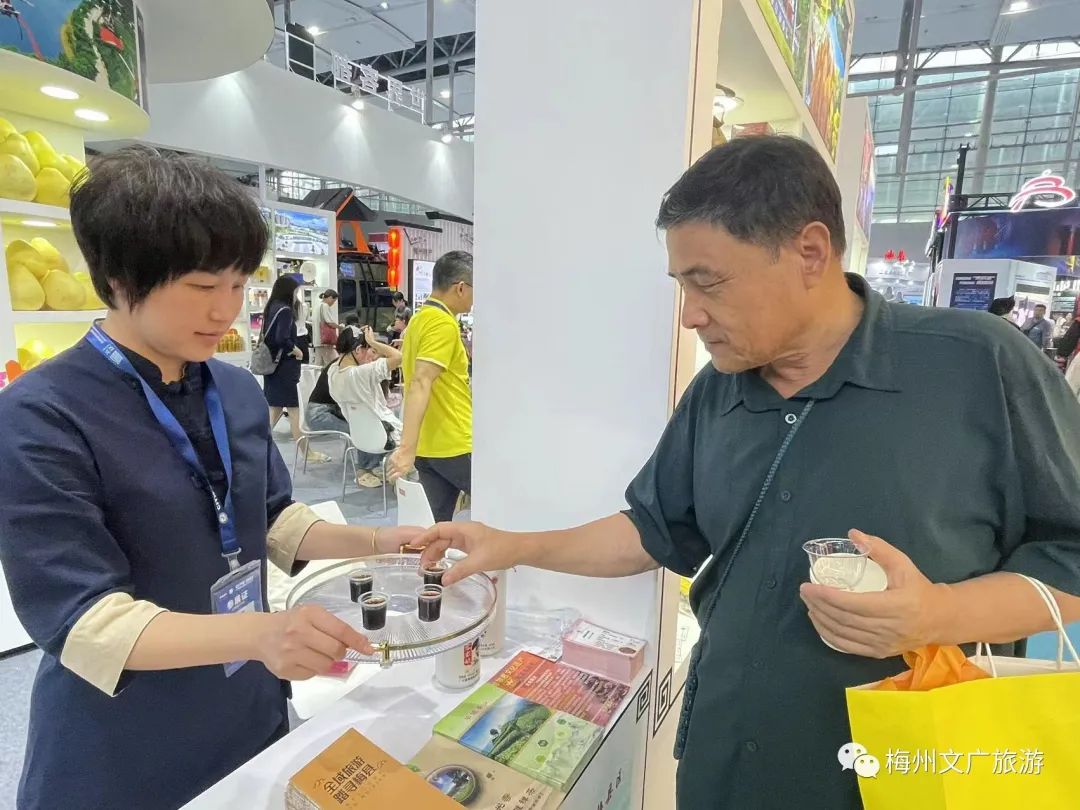 文旅资源展示区、非遗文创产品展示区、非遗艺术展演区、茶艺展示区……梅州展馆内设置了多个展示区,通过宣传视频播放、图文资料派发、资源推介等方式,集中展示梅州文旅融合新趋势、新业态,向世界积极推介我市文化和旅游资源。