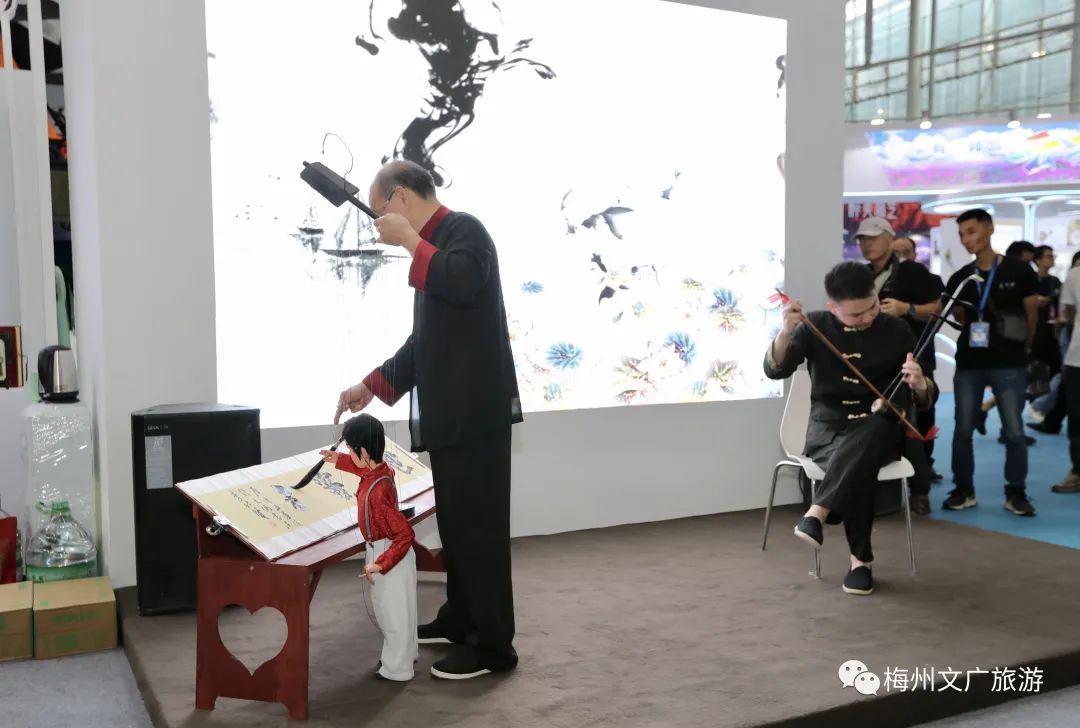 广东汉剧传承研究院的广东汉剧折子戏《扈家庄》,五华县提线木偶传习所的提线木偶书法《世界客都》、提线木偶舞蹈《北京的金山上》等非遗项目轮番上演,吸引众多参展观众驻足观看,现场气氛热烈、燃情不断,让参展观众近距离感受梅州非遗魅力。