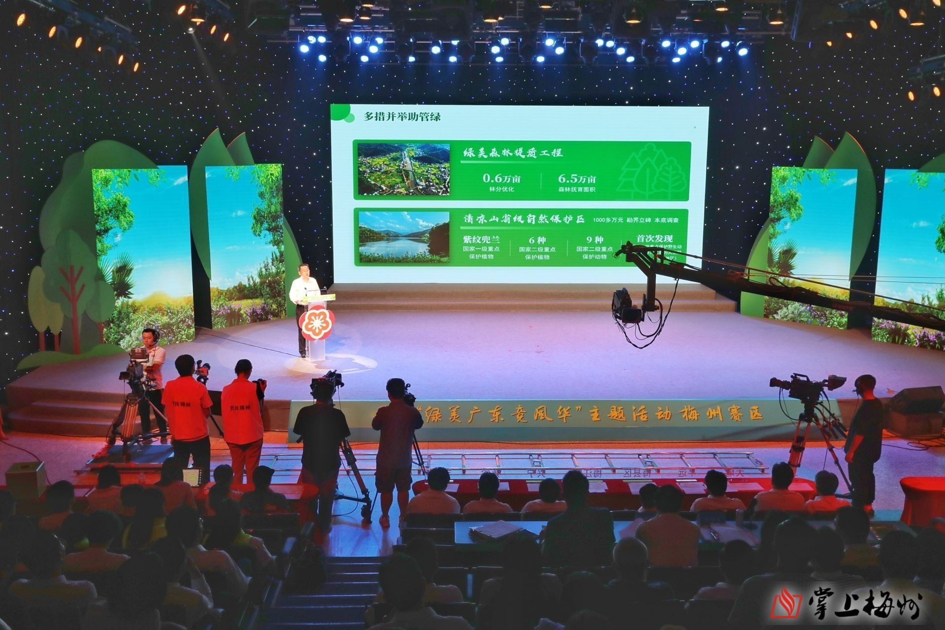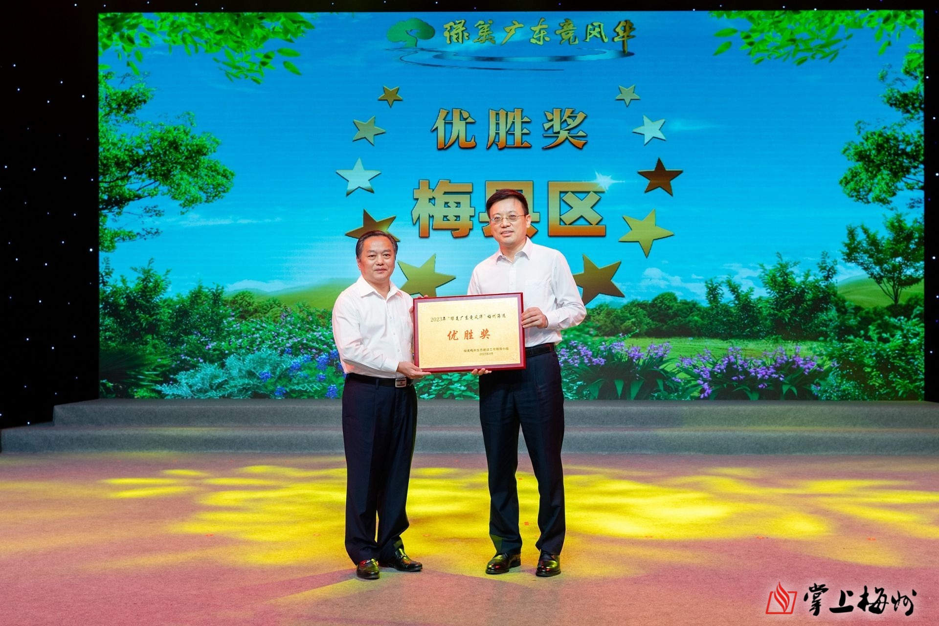 活动现场,梅州赛区8个县(市、区)的第一林长同台比拼,从绿美广东生态建设组织实施情况、绿美广东生态建设示范点建设情况、绿美广东生态建设六大行动建设情况等三方面,结合PPT现场阐述、抽题问答、专家提问等环节,向评委们阐述了对绿美广东的理解与认识,并展现了今年以来绿美生态建设取得的初步成效以及接下来的规划部署。赛前,各县(市、区)还制作了《县区林长话“绿美”》短视频进行风采展示;市林业局也组织走访组对各地落实绿美广东生态建设工作情况开展了实地走访。现场比赛环节结束后,评审团根据“自评报告、实地走访、现场表现”等进行综合评分,梅县区获得梅州赛区优胜奖。
