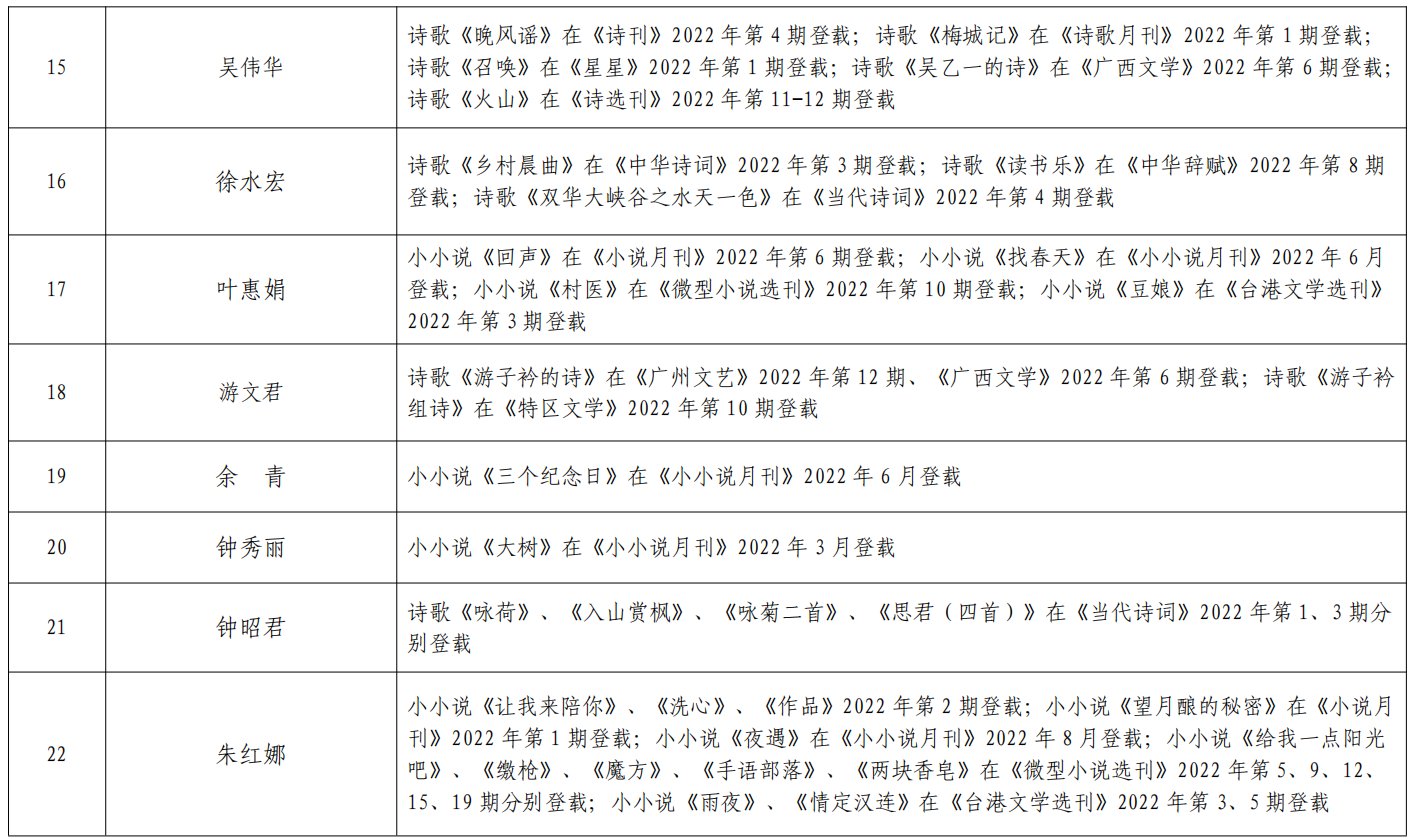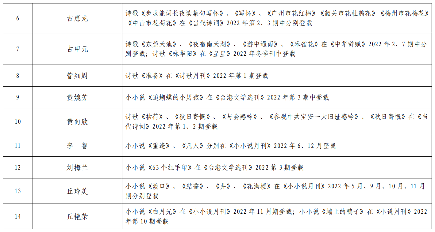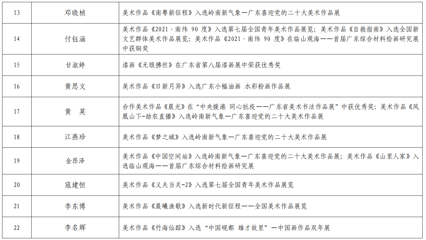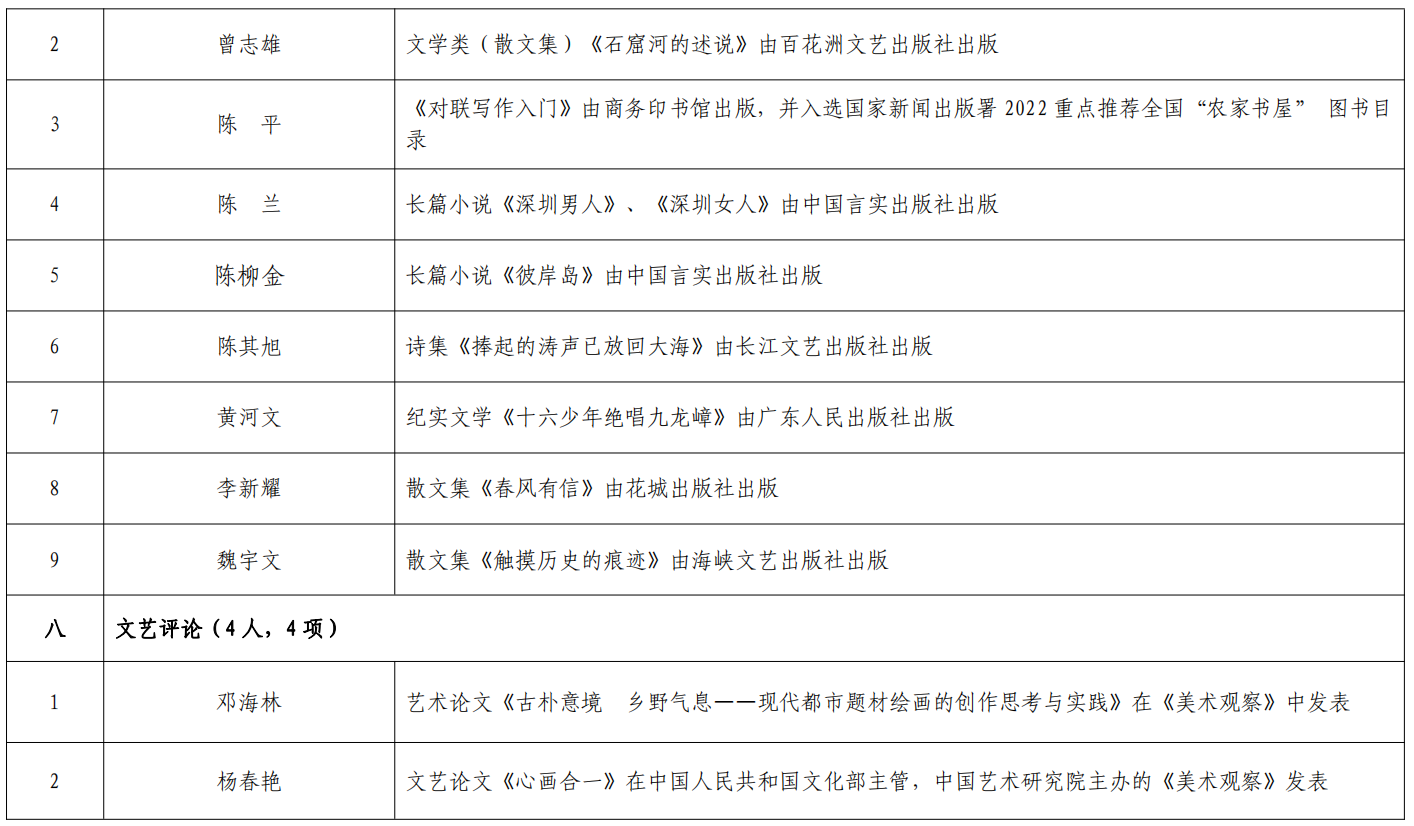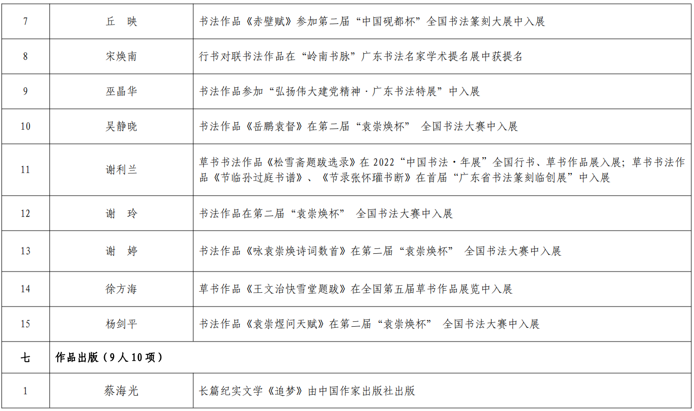 2022年,在市委、市政府和市委宣传部的正确领导下,梅州市文联按照《梅州市文联文艺“双精”工程的实施意见(试行)》,致力培育精英人才、精品创作,推动梅州文艺繁荣发展。全市文联组织坚持以习近平新时代中国特色社会主义思想为指导,全面贯彻落实习近平总书记关于宣传思想工作、文艺工作、群团工作的重要论述精神,团结引领广大文艺工作者围绕中心、服务大局,深入生活、扎根人民,组织创作推出了一批具有梅州特色、较高艺术水准、深受人民群众喜爱的精品力作。2022年度梅州市文艺“双精”工程共有9个类别198个项目,127个人获得“双精”工程奖。经市文联党组研究,决定对获奖的梅州市梅县区客家山歌传承保护中心、梅州市公安文联2个单位和陈柳金等进行通报。