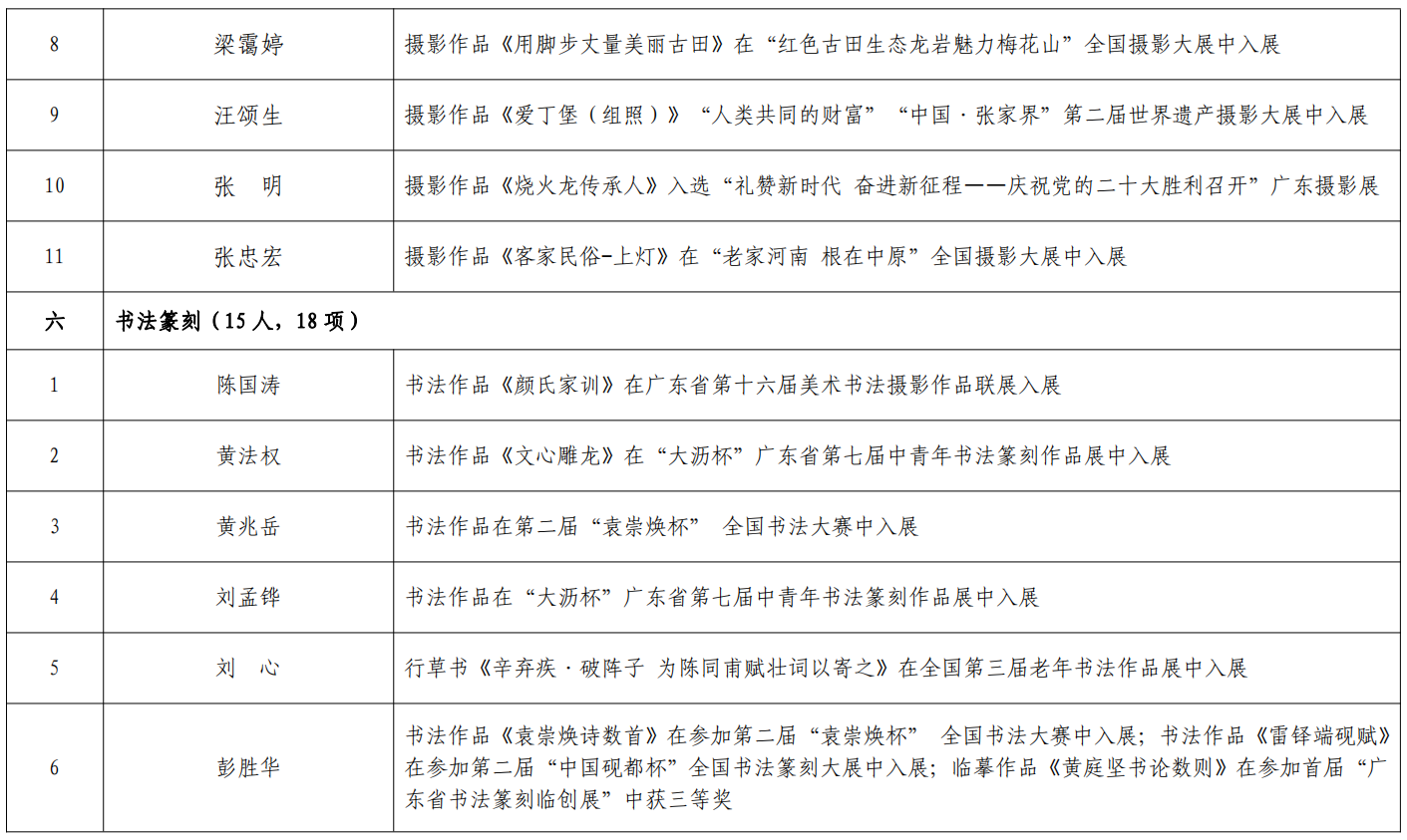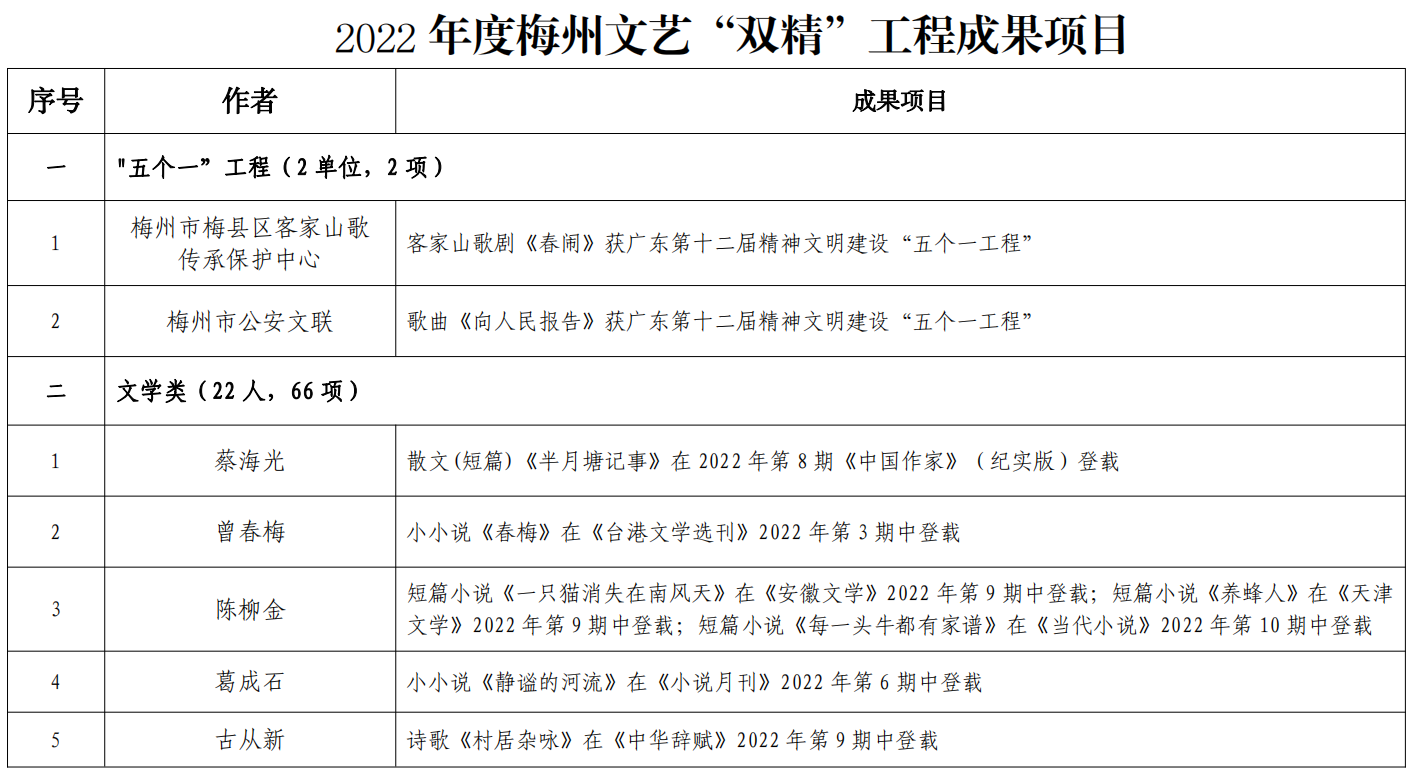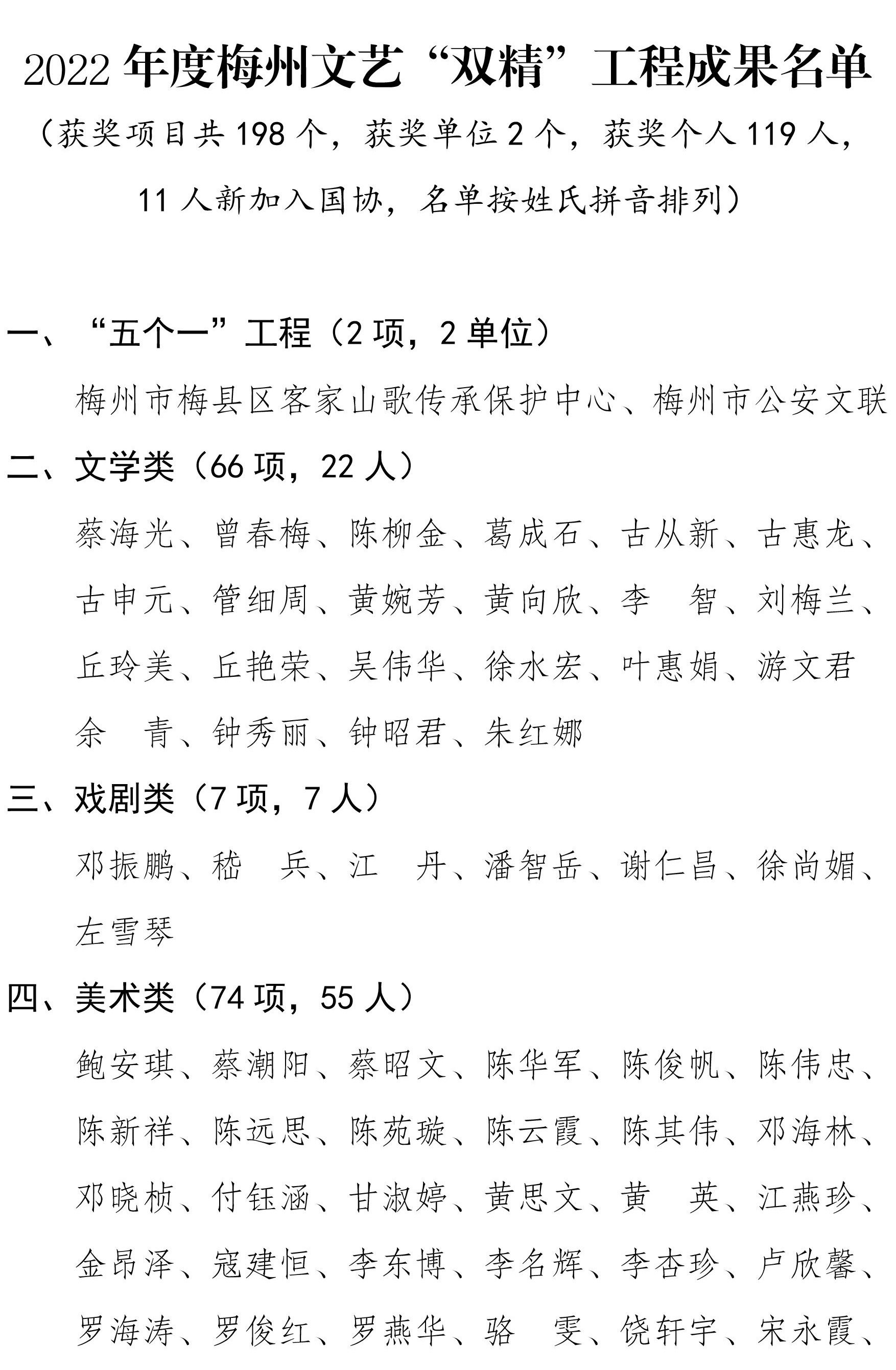 掌上梅州讯 9月26日,市文联通报了2022年度梅州文艺“双精”工程成果名单,共有 9个类别198个项目,127个人获得“双精”工程奖。