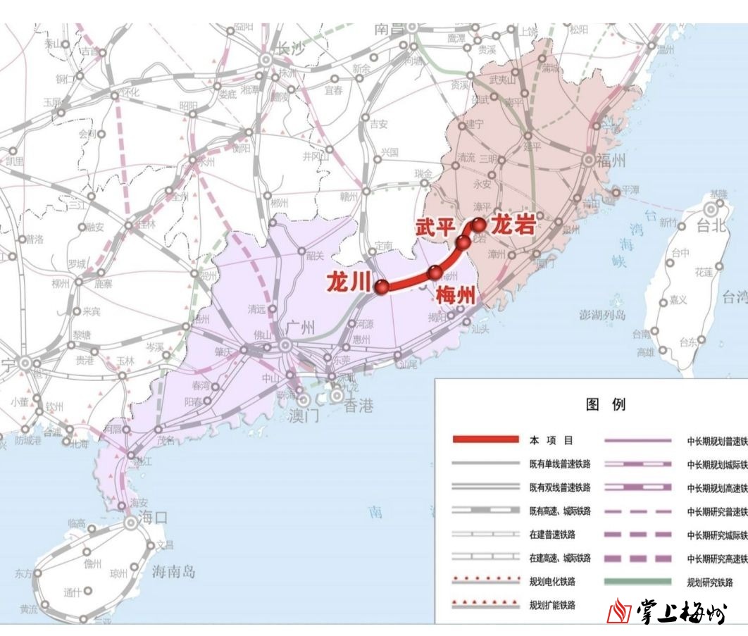 据了解,新建龙岩至龙川铁路为国家中长期铁路网规划项目,东起福建省龙岩市,途经上杭县、武平县进入广东省梅州市,终于河源市龙川县,新建正线全长约260公里,项目按龙岩至武平、武平至梅州、梅州至龙川三段分期建设。其中龙岩至武平段位于福建省内,计划2023年12月通车;梅州至龙川段已在2020年6月开工,计划2024年6月底通车;武平至梅州段,经武平县、蕉岭县、梅县区、梅江区,设武平站、蕉岭站、雁洋西站、梅州站、梅州西站,新建正线全长约101.688公里,争取今年内开工,预计建设工期为四年,按250公里/小时建设。