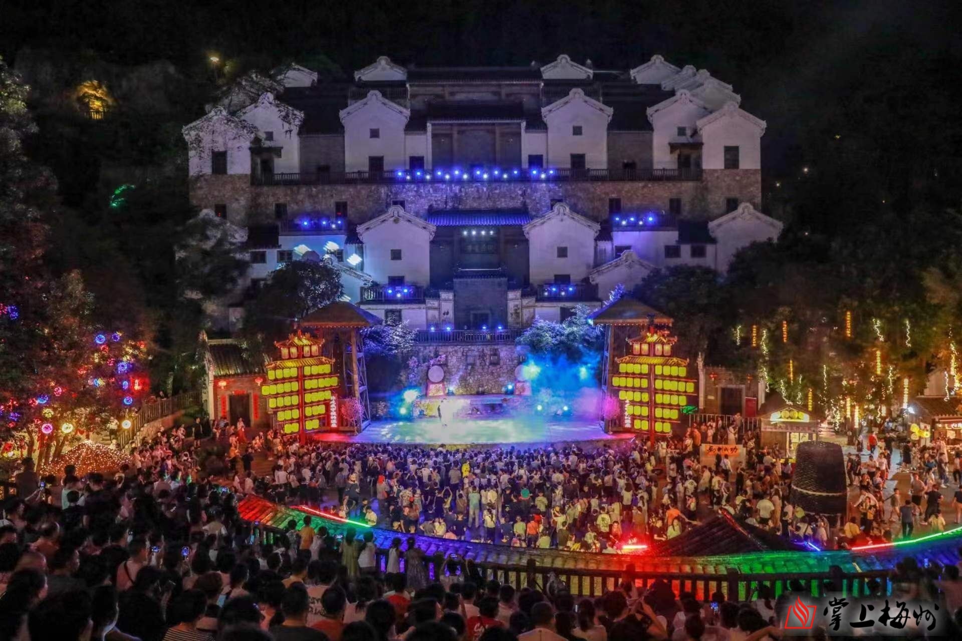 梅州客天下景区内的客家小镇人山人海。(景区供图)