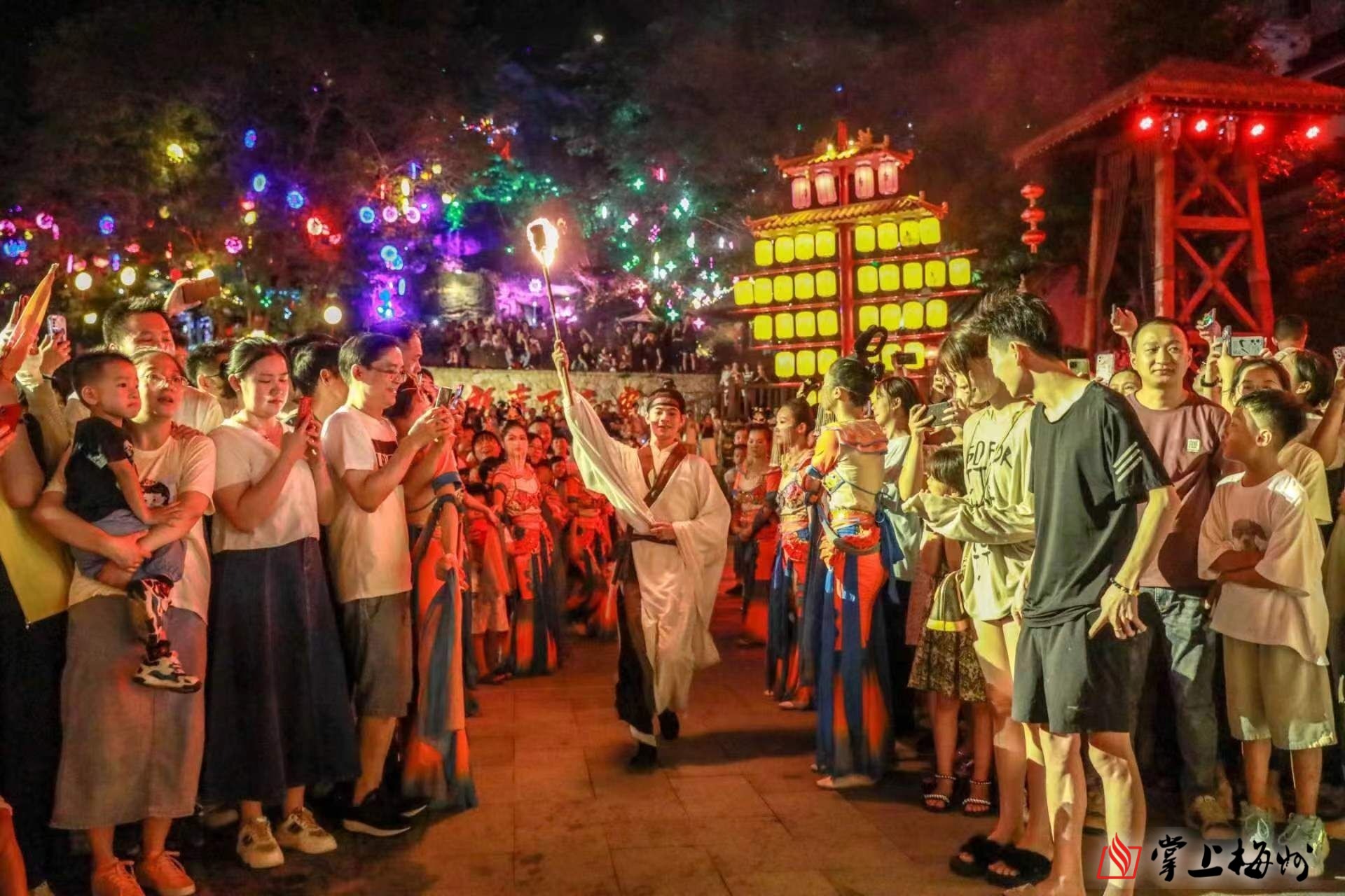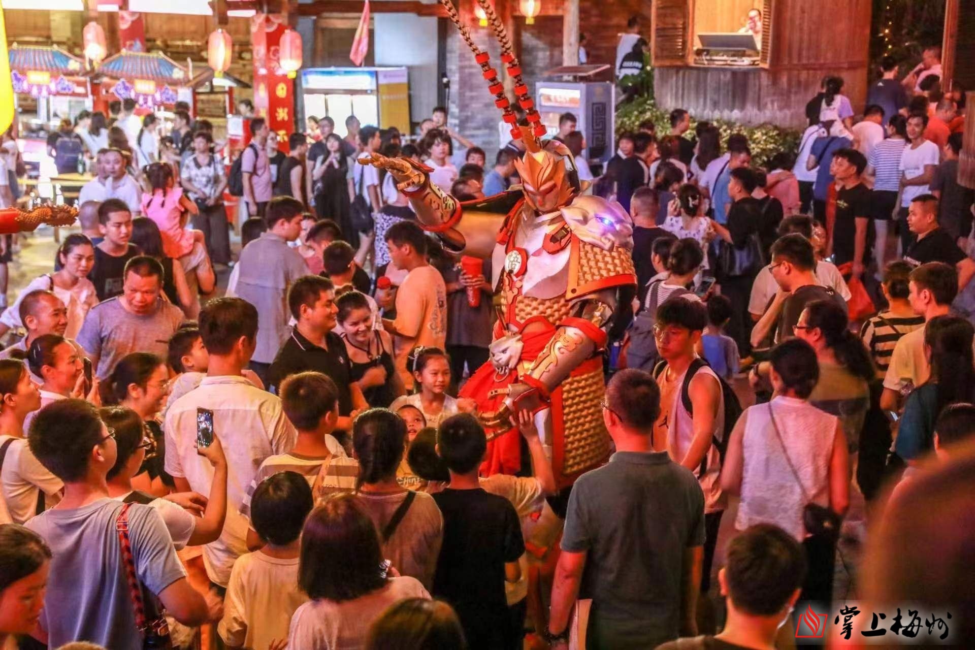 唐僧师徒、东海龙王、牛魔王、嫦娥仙子、观音娘娘、天竺少女……10月1日,走进梅州客天下景区内的客家小镇,西游记中的各路“神仙精怪”不断与游客们偶遇,进行互动交流。夜晚华灯初上时,大唐华灯柱、紫藤花长廊、百家姓灯笼墙等吸引了众多游客打卡拍照,国潮不夜城专场演出让游客感受到盛唐风范,领略国潮魅力。据该景区相关负责人介绍,景区自9月29日起连续8天开展“寻梦西游·欢乐盛唐”中秋国庆国朝游园会活动,每日活动分上午场、下午场和晚上场,让广大市民游客欢度佳节、享受美好假期。