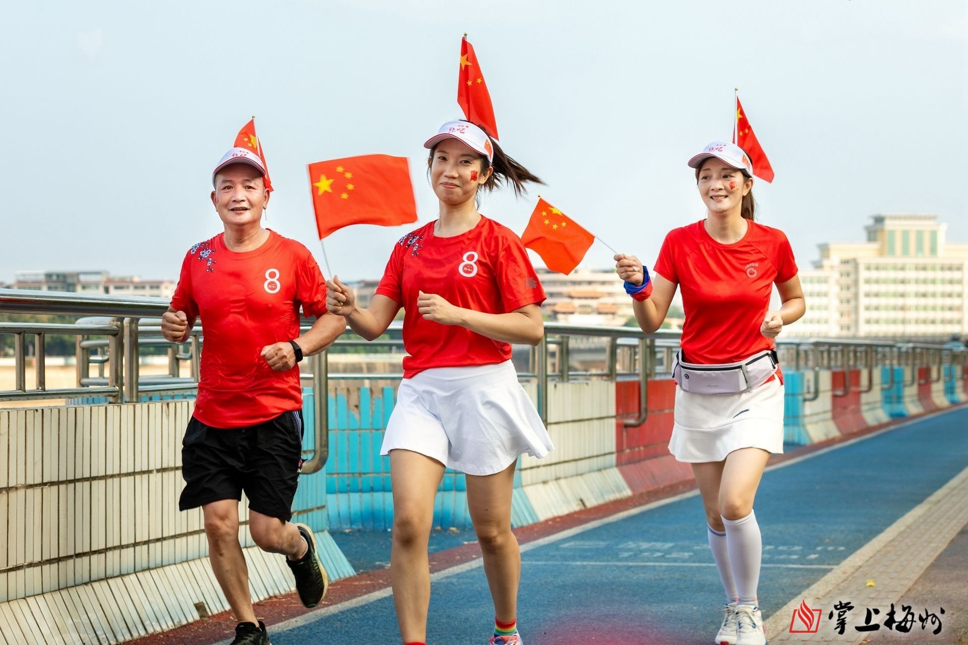 10月1日清晨,梅城的跑步爱好者们也用自己喜欢的方式,为祖国庆生献上自己特别的祝福。在沿江河堤上,记者看到,来自我市的约百名跑步爱好者自发组织前来晨跑,只见他们身着统一的红色上衣,手持五星红旗在沿江塑胶跑道开跑。“我们早上从剑英体育馆出发,沿江往广州大桥方向慢跑。”跑步爱好者张庆勤告诉记者,梅城跑友们都希望通过这种健康向上的方式表达对祖国的爱。