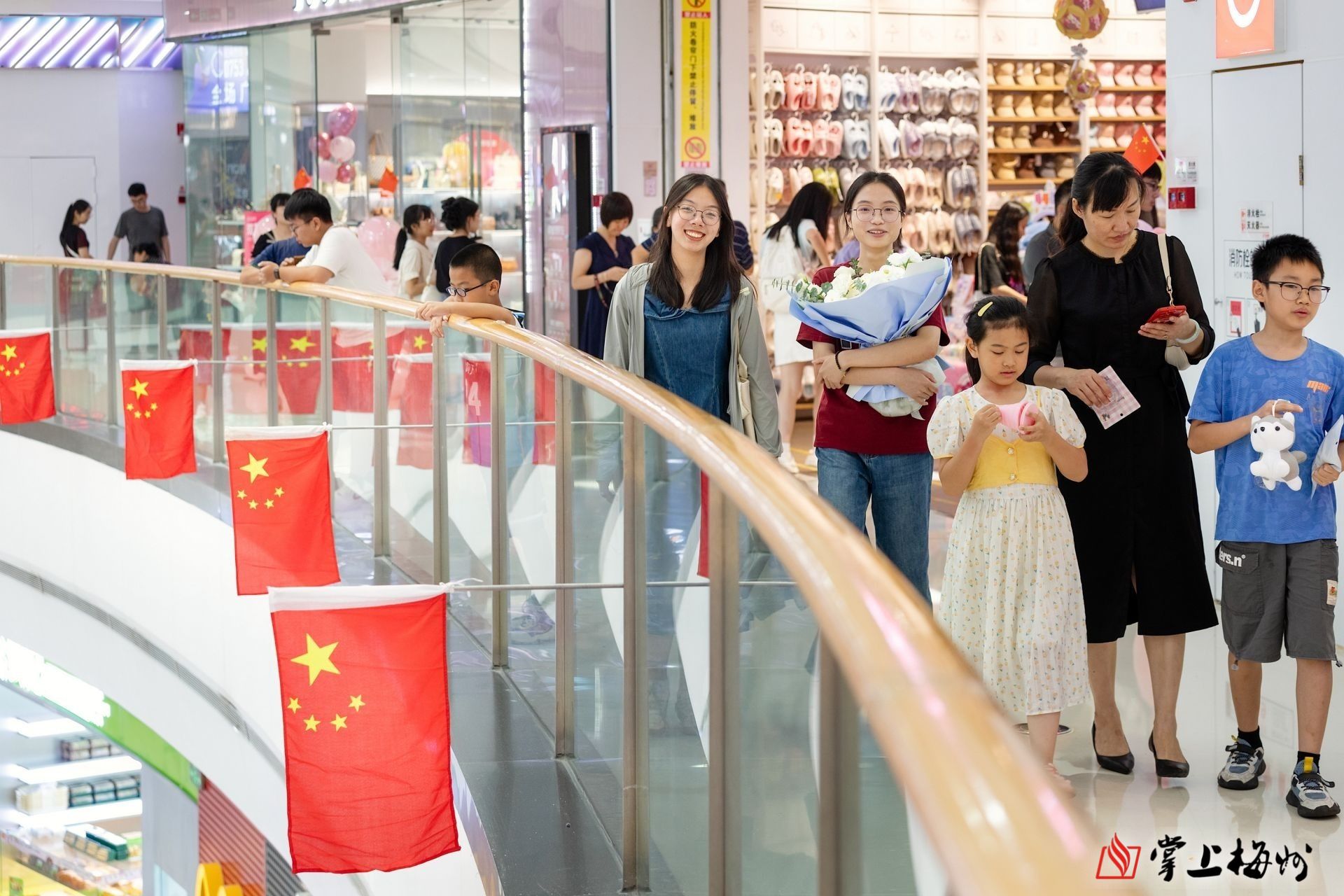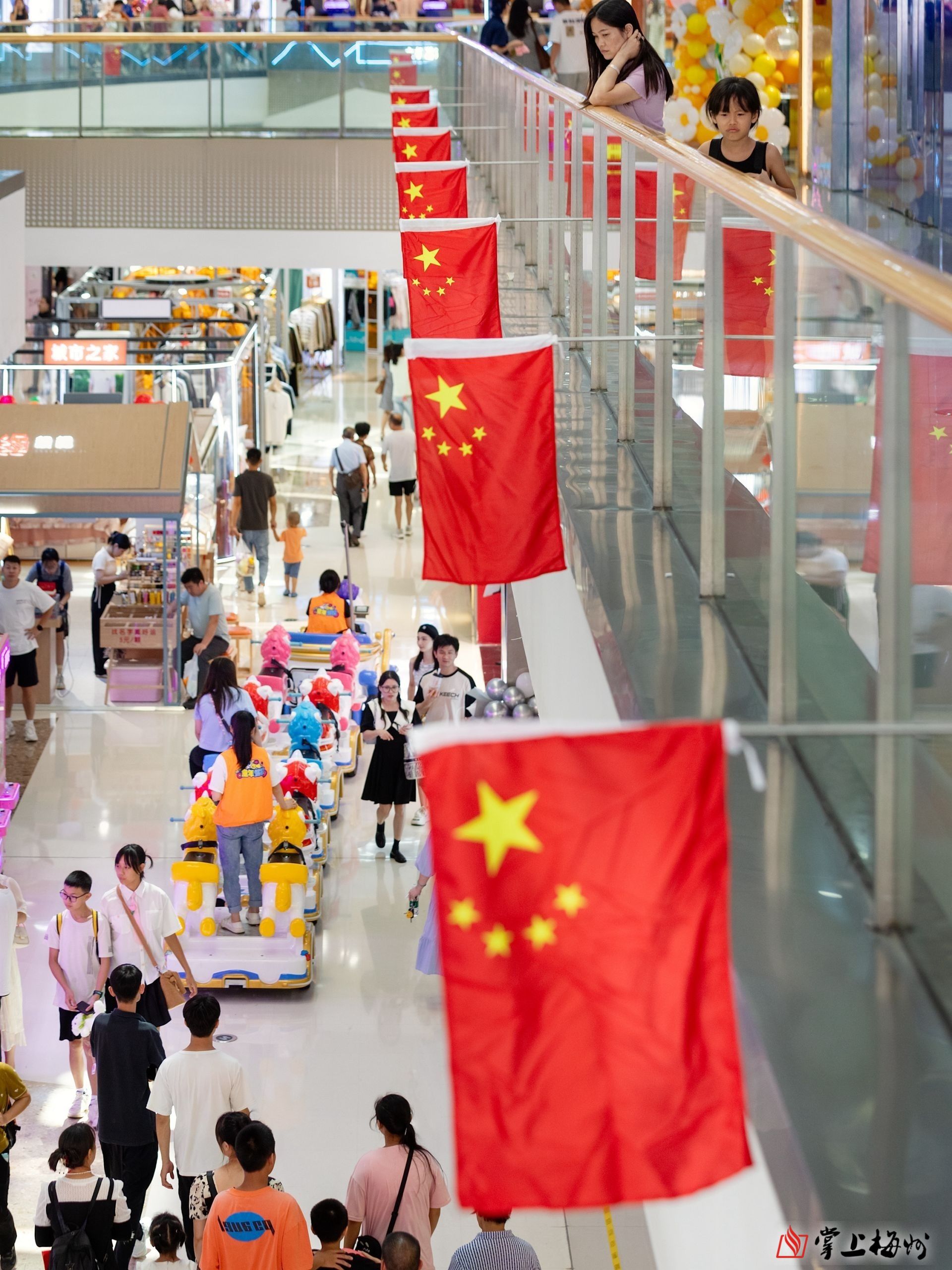 梅州万达广场挂满国旗,洋溢着热烈、喜庆的节日气氛。