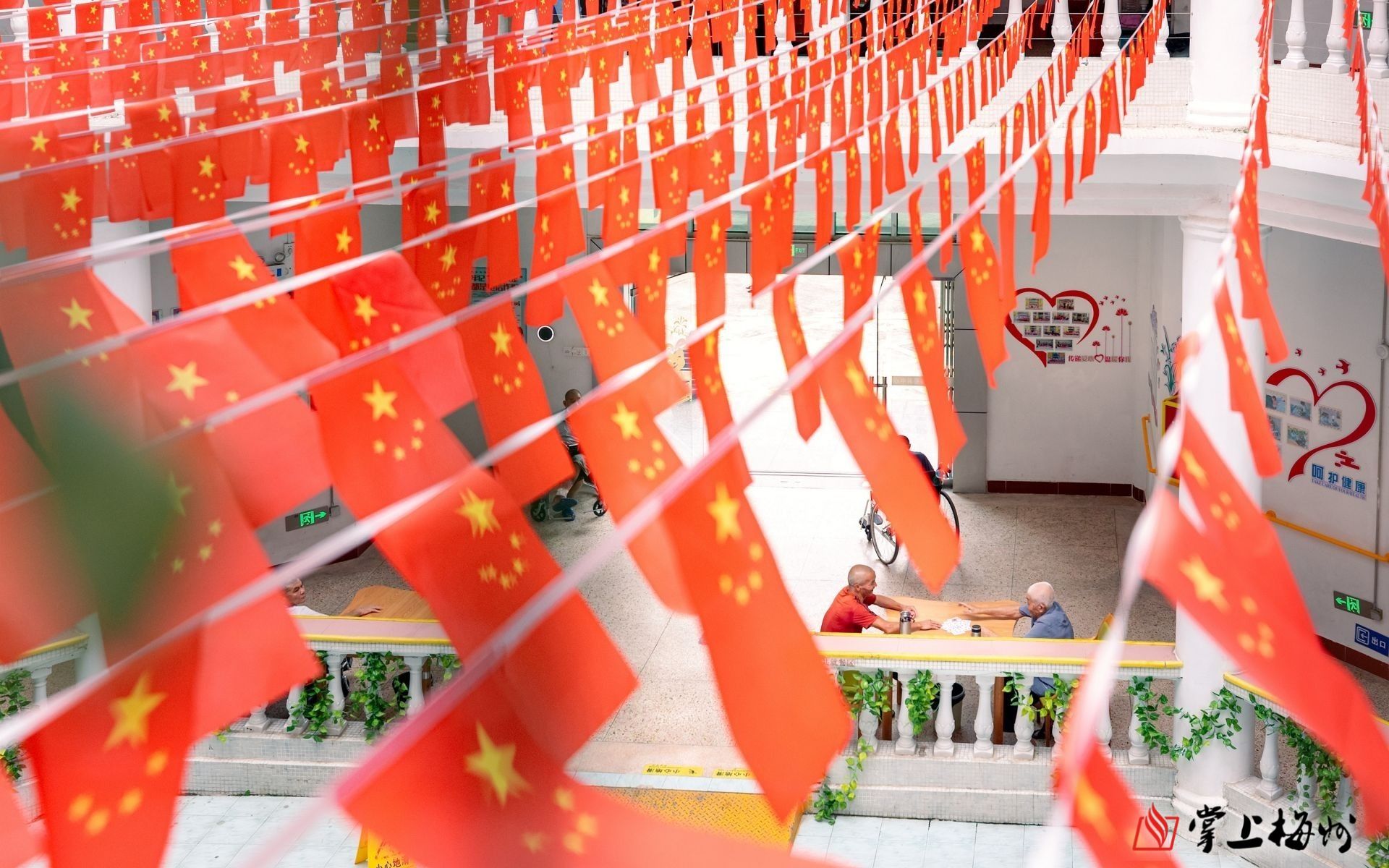 在丰顺县社会福利中心,一面面国旗迎风招展,老人们在大厅休闲娱乐,显得格外温馨。