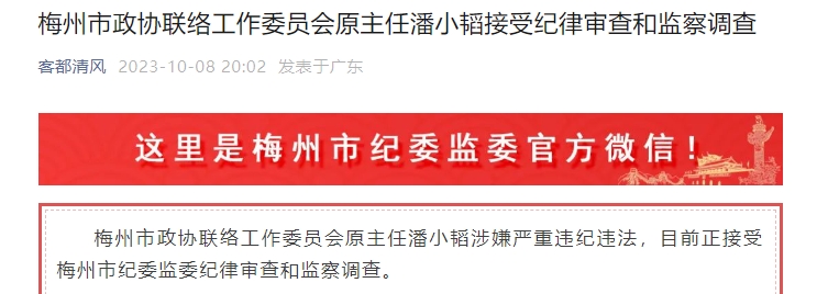 梅州市政协联络工作委员会原主任潘小韬涉嫌严重违纪违法,目前正接受梅州市纪委监委纪律审查和监察调查。