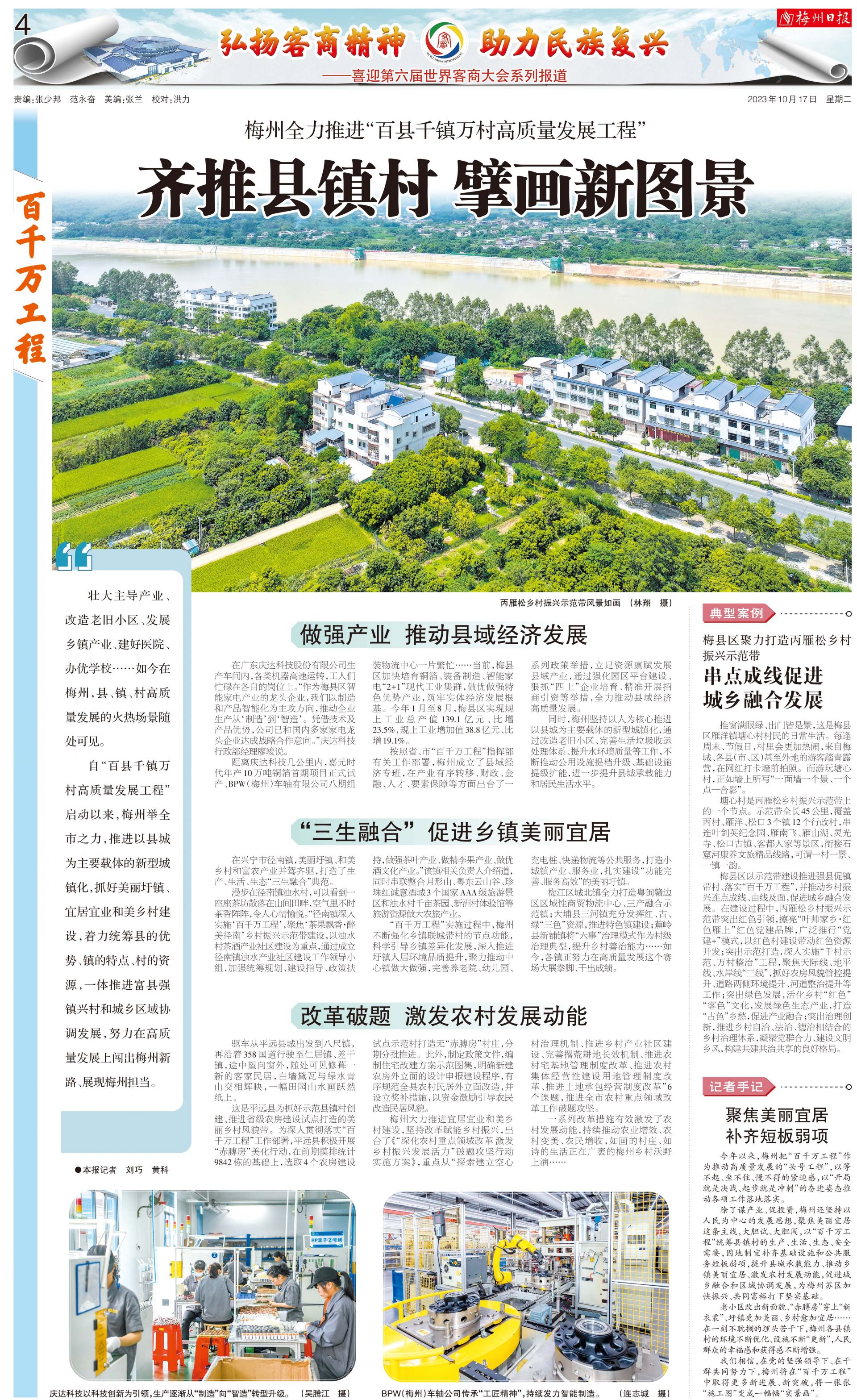 自“百县千镇万村高质量发展工程”启动以来,梅州举全市之力,推进以县城为主要载体的新型城镇化,抓好美丽圩镇、宜居宜业和美乡村建设,着力统筹县的优势、镇的特点、村的资源,一体推进富县强镇兴村和城乡区域协调发展,努力在高质量发展上闯出梅州新路、展现梅州担当。