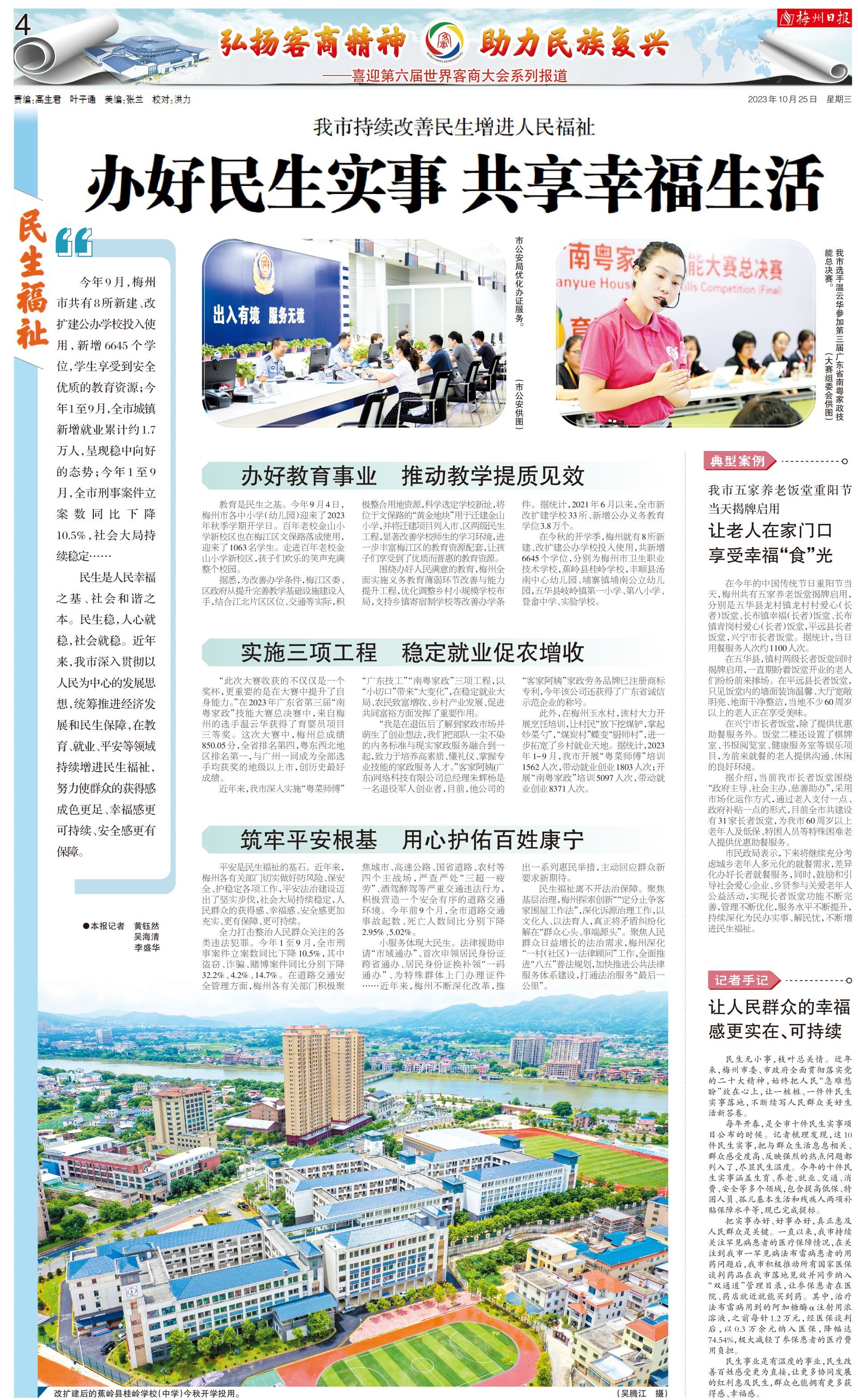 今年9月,梅州市共有8所新建、改扩建公办学校投入使用,新增6645个学位,学生享受到安全优质的教育资源;今年1至9月,全市城镇新增就业累计约1.7万人,呈现稳中向好的态势;今年1至9月,全市刑事案件立案数同比下降10.5%,社会大局持续稳定……