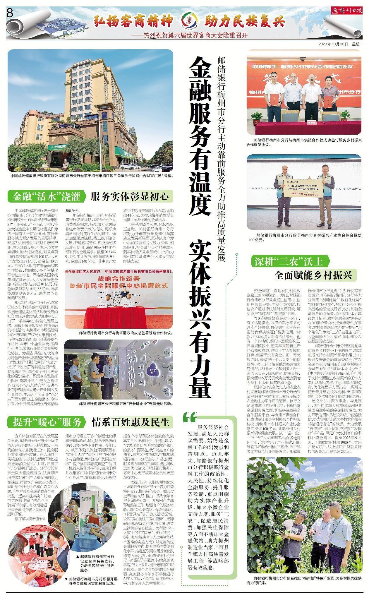 坚持信贷资金优先支持农业农村发展是邮储银行梅州市分行始终坚守服务“三农”初心、充分发挥支农金融主力军作用的缩影。该行立足遍布城乡的服务网络,不断拓宽金融服务覆盖面,积极搭建政银企合作服务平台,与梅州市供销合作社成功签订服务乡村振兴合作框架协议,为梅州市乡村振兴产业协会意向授信100亿元,共助梅州乡村振兴领域健康发展。以“一县一业、一行一品”为发展思路,结合各地特色产业,创新推出了产业贷款,因地制宜“贷”动梅州柚、平远橙、兴宁鸽等地方特色行业兴旺发展。邮储银行梅州市分行党委书记、行长容宇贵表示,邮储银行梅州市分行将充分利用“协同优势”“数智化优势”“农村市场优势”,努力当好乡村振兴战略的坚定执行者、农村基础金融服务的引领者、农村信用体系建设的开拓者、农村普惠金融“源头活水”的供给者、农村金融创新的探索者、农村金融风险防范的守护者“六个角色”,争做“三农”金融主力军,为全面推进乡村振兴、加快建设农业强国贡献力量。