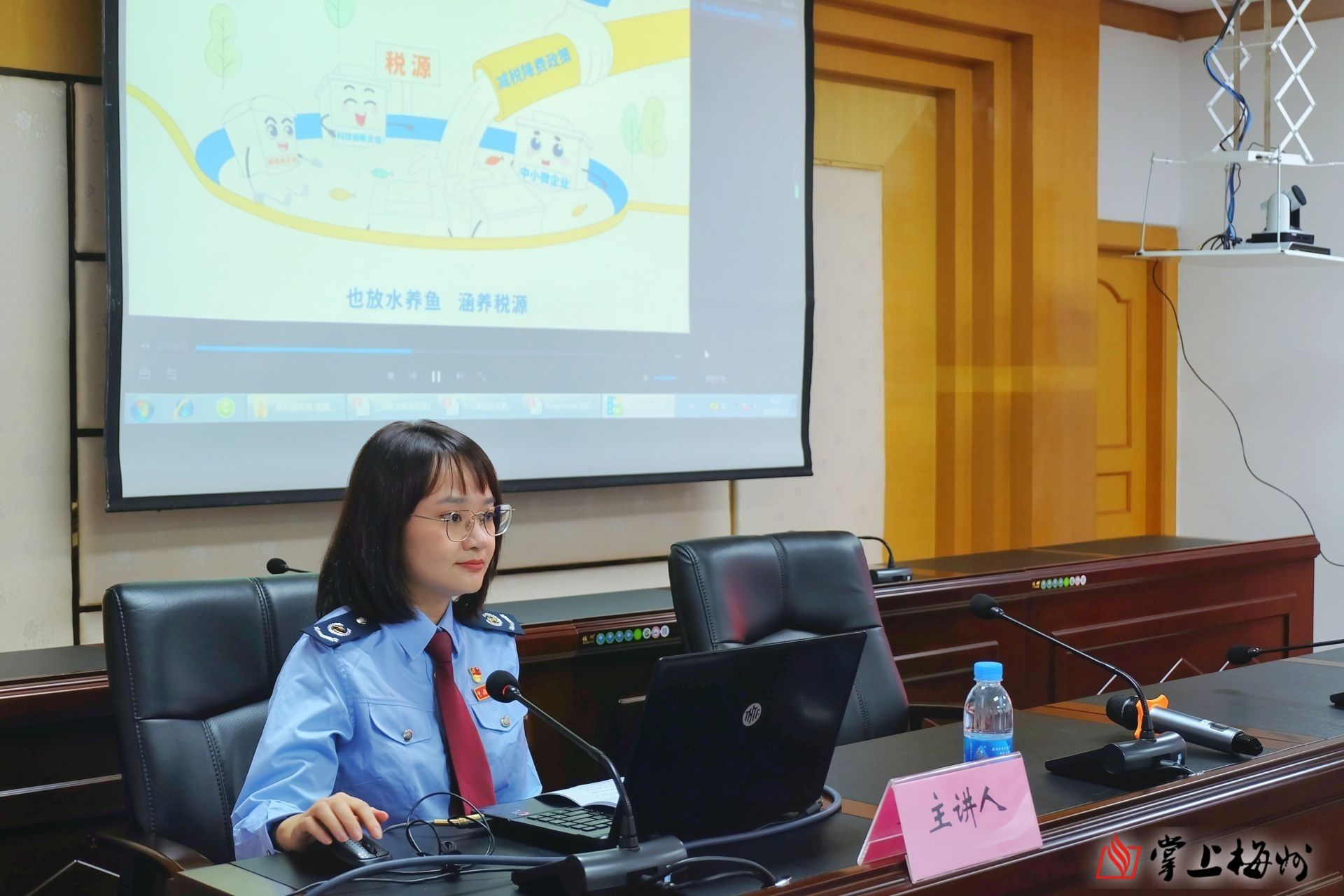 梅州市税务局业务骨干针对中小微企业与重点群体税收优惠政策进行宣讲。