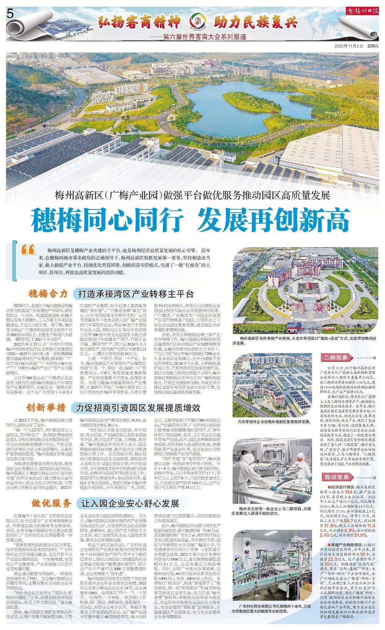 梅州高新区是穗梅产业共建的主平台,也是梅州经济高质量发展的核心引擎。 近年来,在穗梅两地市委市政府的正确领导下,梅州高新区狠抓发展第一要务,坚持制造业当家,做大做强产业平台,持续优化营商环境,创新招商引资模式,引进了一批“打粮食”的大项目、好项目,释放出高质量发展的澎湃动能。