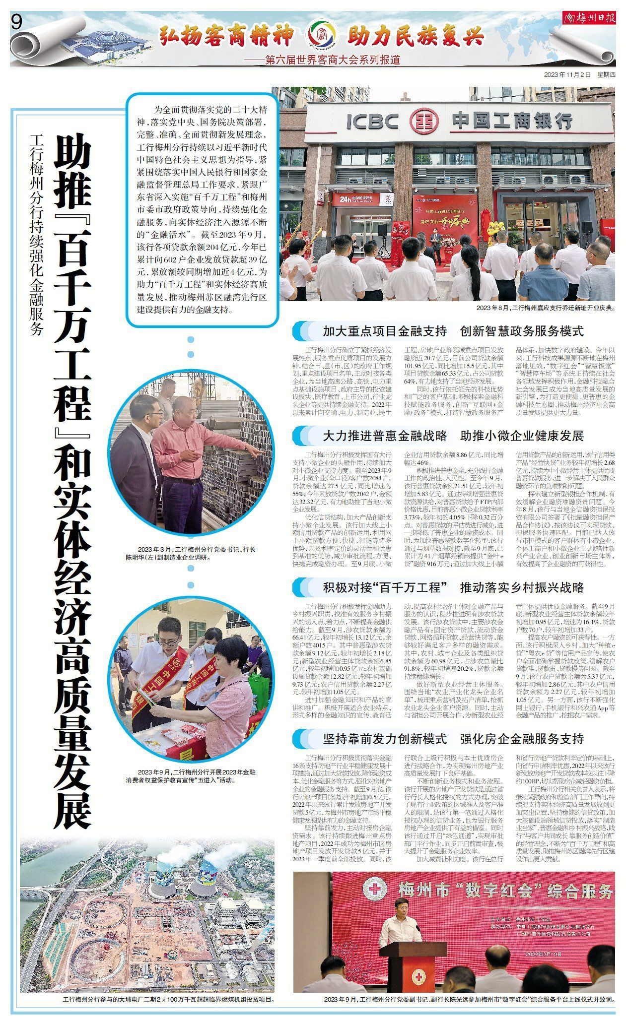 为全面贯彻落实党的二十大精神,落实党中央、国务院决策部署,完整、准确、全面贯彻新发展理念,工行梅州分行持续以习近平新时代中国特色社会主义思想为指导,紧紧围绕落实中国人民银行和国家金融监督管理总局工作要求,紧跟广东省深入实施“百千万工程”和梅州市委市政府政策导向,持续强化金融服务,向实体经济注入源源不断的“金融活水”。截至2023年9月,该行各项贷款余额204亿元,今年已累计向602户企业发放贷款超39亿元,累放额较同期增加近4亿元,为助力“百千万工程”和实体经济高质量发展,推动梅州苏区融湾先行区建设提供有力的金融支持。