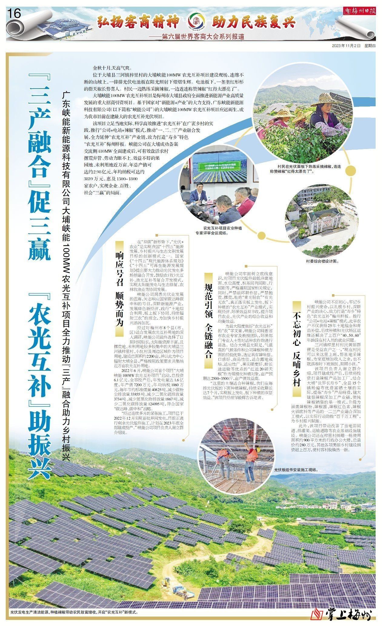 该项目立足当地实际、科学高效推进“农光互补”在广袤乡村的实践,推行“公司+电站+辣椒”模式,推动“一、二、三”产业融合发展,全力延伸“农光互补”产业链,致力打造“寿乡”特色“农光互补”梅州样板。峡能公司在大埔成功备案交流侧410MW全面建成后,可有效盘活农村撂荒弃管、劳动力跟不上、效益不好的果园地、未利用地近万亩,年总产值可达约2.98亿元,年均纳税可达约3839万元,惠及1500-1800家农户,实现企业、百姓、社会“三赢”的局面。