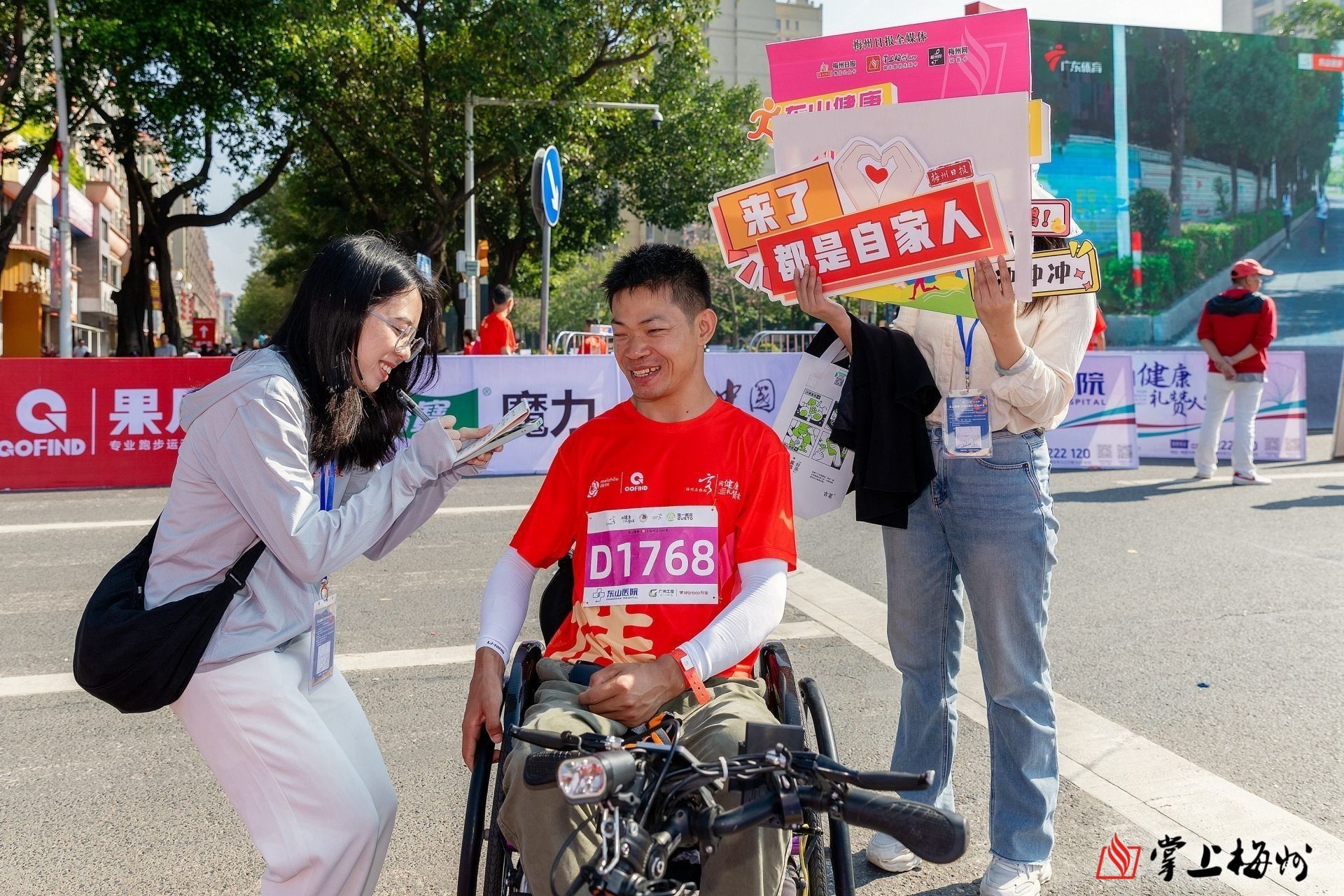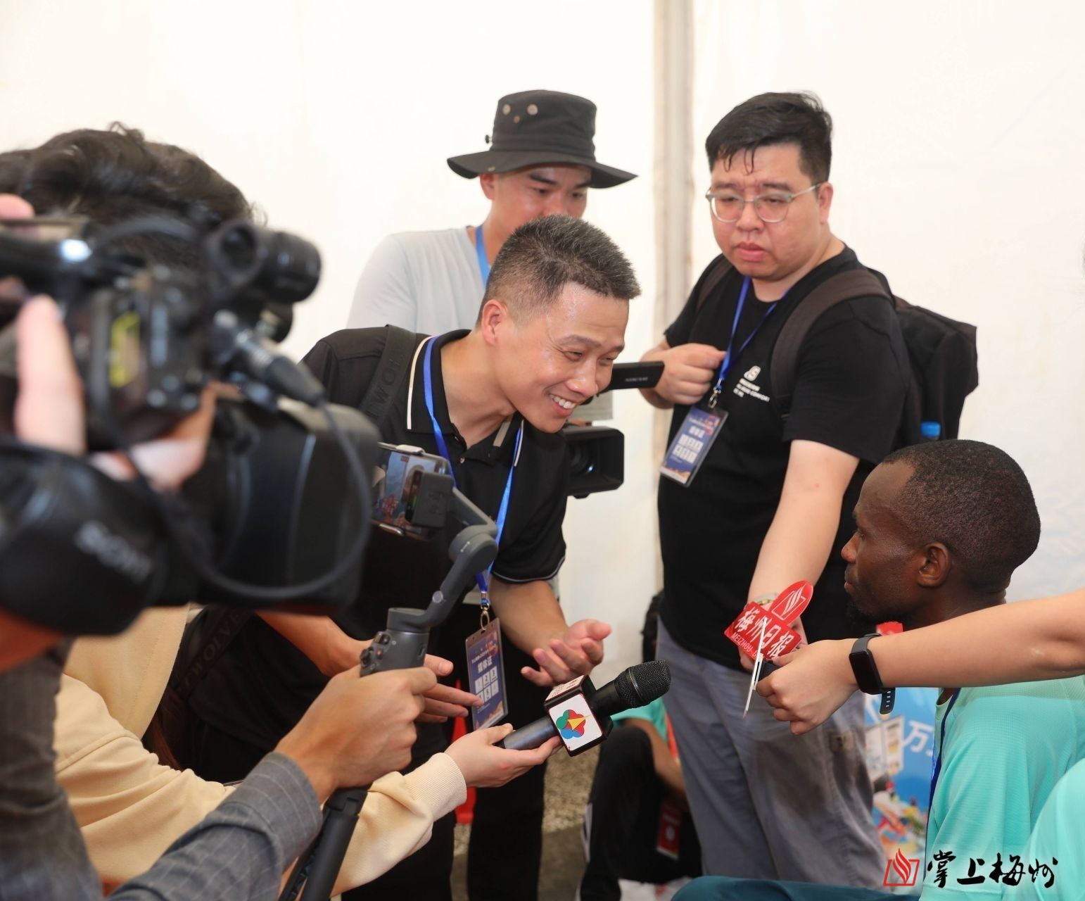 记者黄科(左二)、陈坚平(右二)采访东山健康·2023梅州马拉松赛男子全马冠军。
