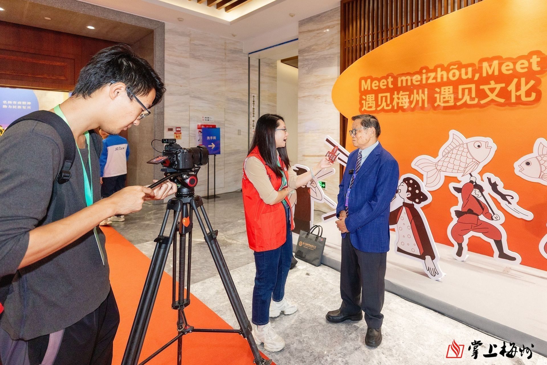 第六届世界客商大会期间,澳门嘉应同乡会创会会长、澳门梅州商会会长黄铨昌在会场接受记者李艳良(中)、吴锰(左一)采访。