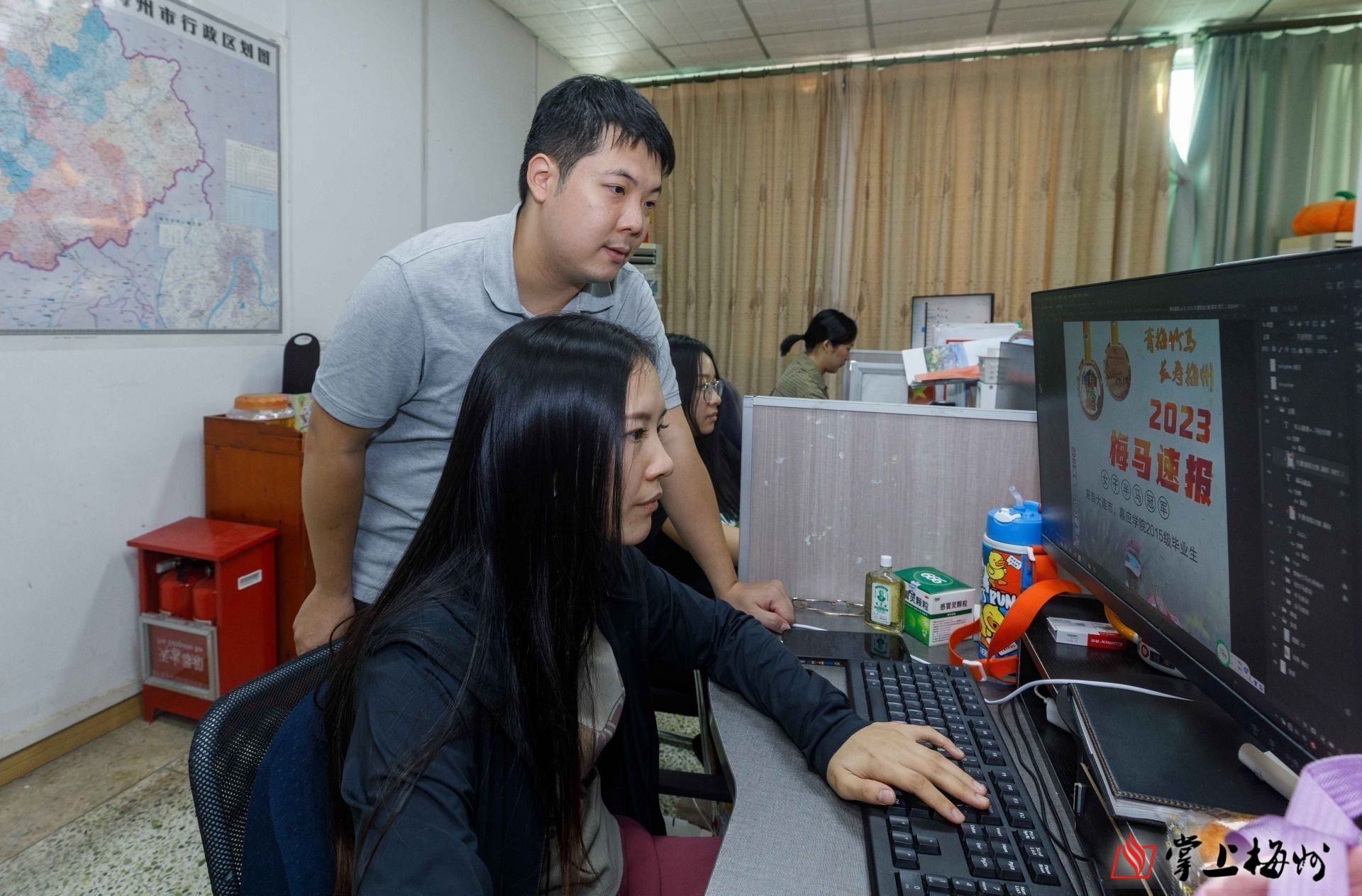 东山健康· 2023梅州马拉松赛期间,记者编辑全员上阵,前后方联动,第一时间推送比赛信息。图为记者罗诚浩(站立者)和美编张莹在商讨制作海报内容。