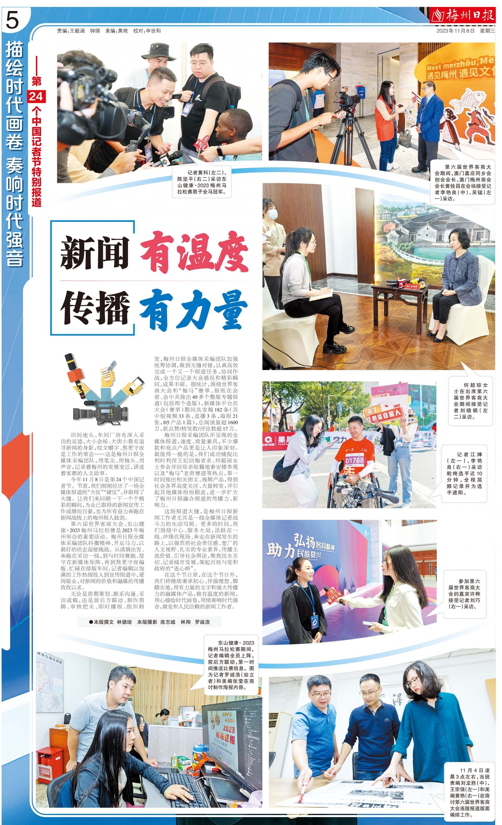 无论是前期策划、联系沟通、采访成稿,还是前后方联动、制作剪辑、审核把关、即时播报、组织转发,梅州日报全媒体采编团队加强统筹协调,做到无缝对接,认真高效完成一个又一个报道任务,协同作战,全方位记录大会盛况和精彩瞬间,成果丰硕。据统计,围绕世界客商大会和“梅马”赛事,报纸在会前、会中共推出40多个整版专题报道(包括两个连版),新媒体平台在大会(赛事)期间共发稿182条(其中短视频33条,直播3条,海报21张,H5产品1篇),总阅读量超1600万,获点赞/转发数/评论数超17万。
