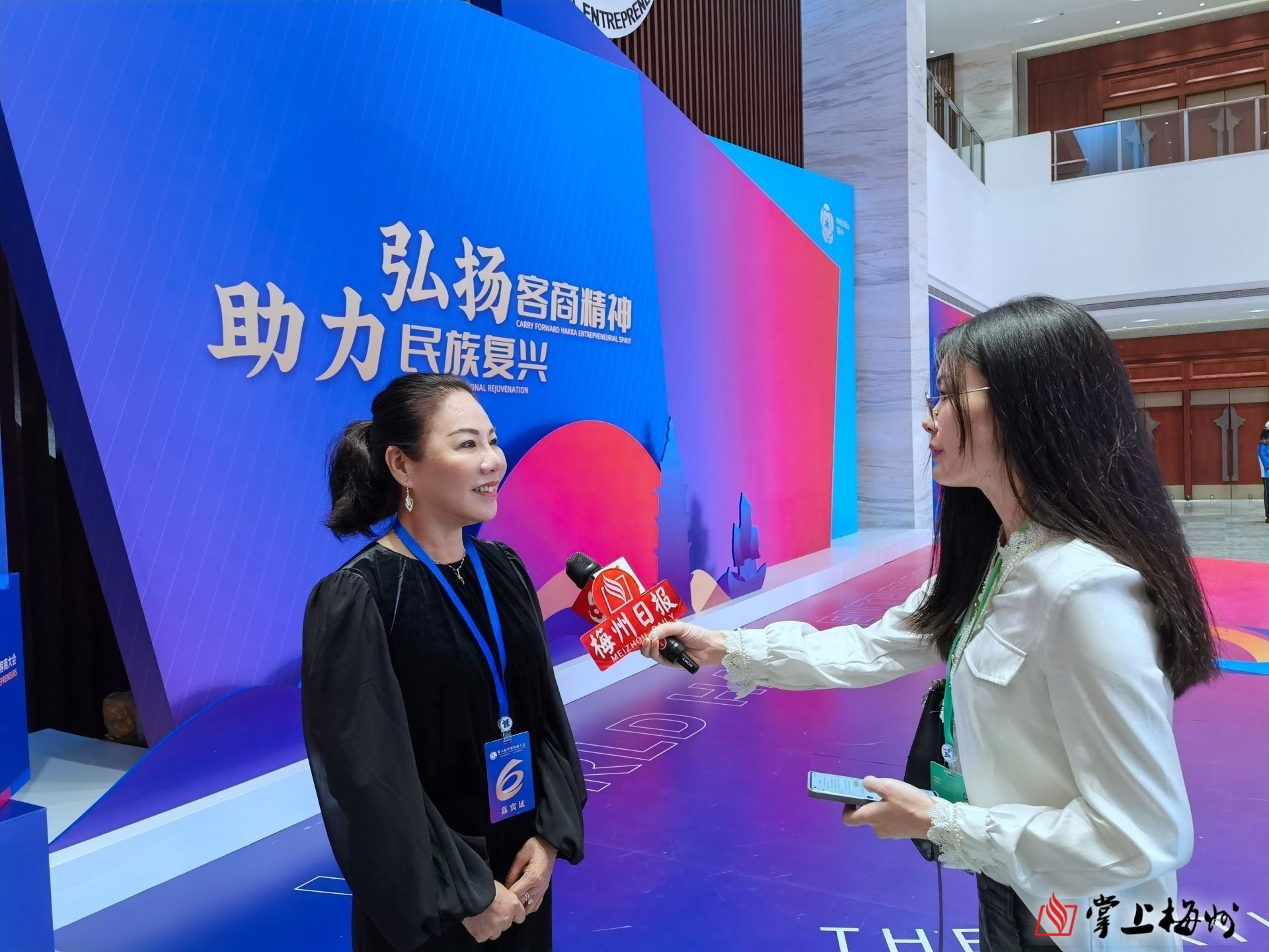 参加第六届世界客商大会的嘉宾许桦接受记者刘巧(右一)采访。