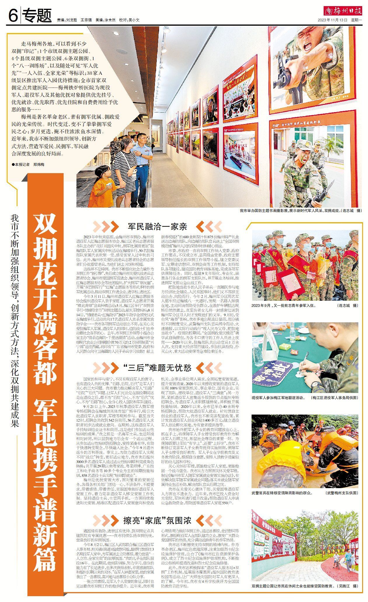今年3月11日,梅州市退役军人红梅志愿服务协会组织退役军人亲子家庭、退役军人志愿者开展“植此青绿”盆栽种植活动;5月,梅江区举行“双拥亲子行·情暖母亲节”双拥主题活动,献礼军嫂妈妈;8月14日,“情暖老兵·红梅助学”2023年助学金颁发仪式在梅城举行,活动共向17名退役军人直系亲属发放助学金……我市各项拥军活动层出不穷,在关心关爱驻梅军人军属、退役军人的同时,边防战士们也牵动着社会各界的心。去年,市双拥工作领导小组办公室主办“情系边海防·千里送温情”活动,由梅州市金绿现代农业公司捐赠价值70万元的2万份预制菜“兴宁鸽”运往西藏,将印有“广东省梅州市党委、政府和人民群众向守卫海疆的人民子弟兵学习致敬!献上新春祝福!”的600盒刺梨汁和875份梅州特产礼盒送达边海防部队,向边海防部队官兵送上“全国双拥模范城”梅州人民的深情牵挂和暖心情谊。
