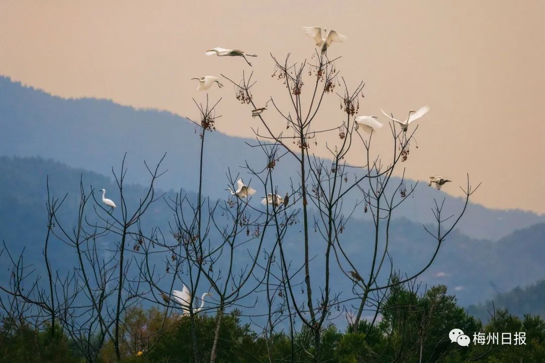 ▲2023年10月,在大埔县高陂镇党溪村新形成的湿地,成群白鹭在枝头休憩嬉戏,形成了一道人与自然和谐共处的生态乡村画卷。(连志城 摄)